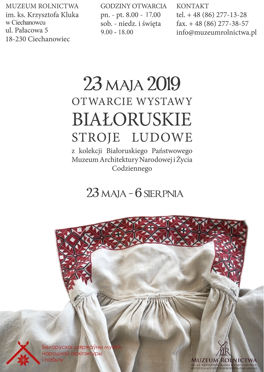 Dorota Łapiak Dyrektor Muzeum Rolnictwa im. ks. Krzysztofa Kluka w Ciechanowcu oraz Eduard Bahdanovich Dyrektor Białoruskiego Państwowego Muzeum Architektury Narodowej i Życia Codziennego zapraszają na wernisaż wystawy Białoruskie Stroje Ludowe.