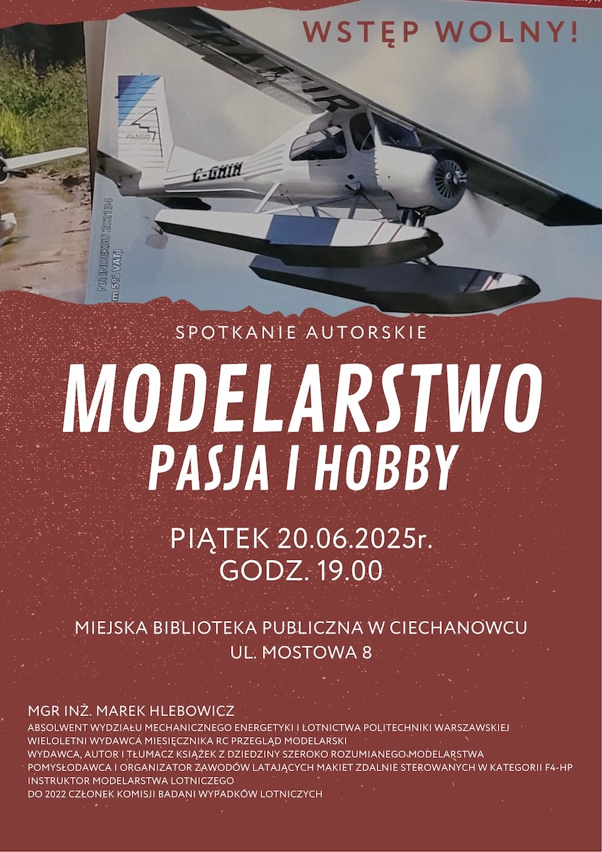 Miejska Biblioteka Publiczna w Ciechanowcu zaprasza na spotkanie autorskie poświęcone modelarstwu lotniczemu. Wydarzenie odbędzie się w piątek, 20 czerwca 2025 roku o godzinie 19:00 w siedzibie biblioteki przy ulicy Mostowej 8.
