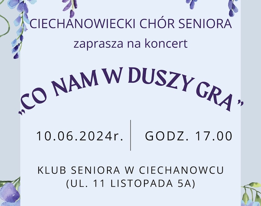 Ciechanowiecki Chór Seniora zaprasza na koncert zatytułowany „Co nam w duszy gra”.