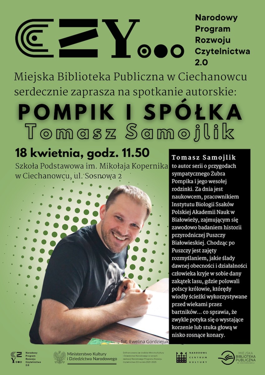 Miejska Biblioteka Publiczna w Ciechanowcu zaprasza na wyjątkowe spotkanie autorskie z Tomaszem Samojlikiem, twórcą bestsellerowej serii książek o żubrze Pompiku i jego rodzince.
