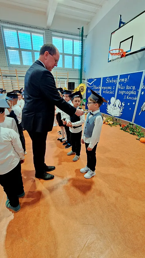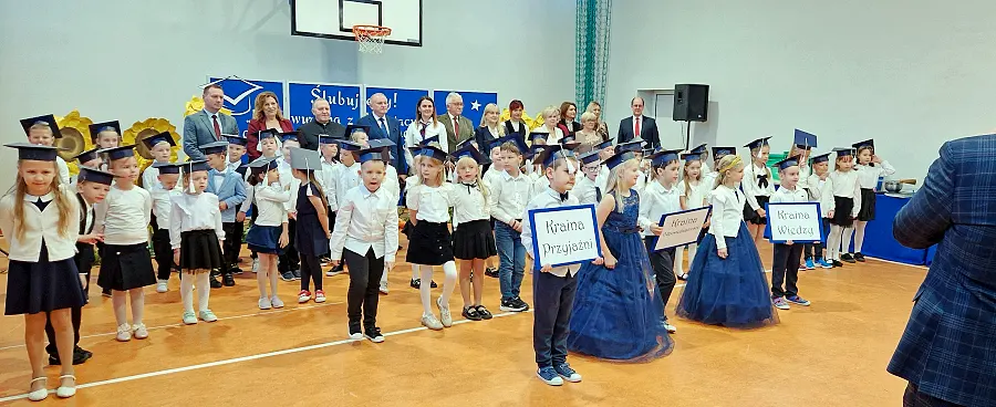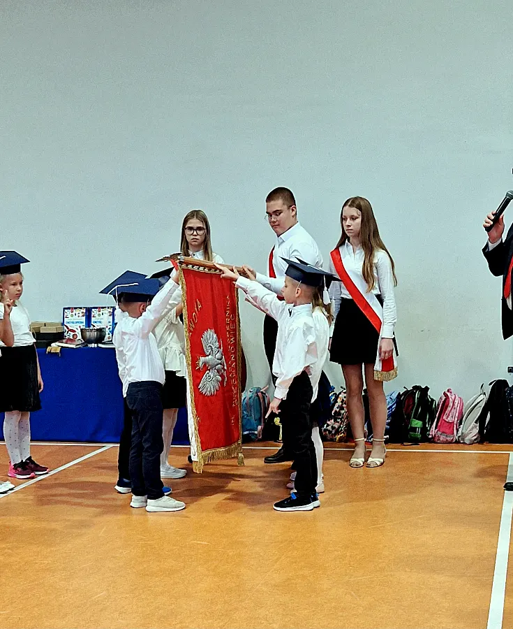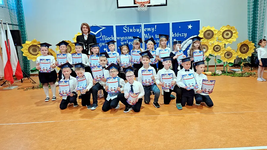 Kulminacyjnym i najbardziej wzruszającym momentem było złożenie przez uczniów uroczystego ślubowania na sztandar szkoły. Po akcie pasowania, każdy pierwszoklasista otrzymał pamiątkowy dyplom oraz swoją pierwszą encyklopedię. O miły gest zadbali również przedstawiciele Banku Spółdzielczego, którzy przekazali uczniom upominki oraz książeczki oszczędnościowe z wkładem w wysokości 20 złotych.