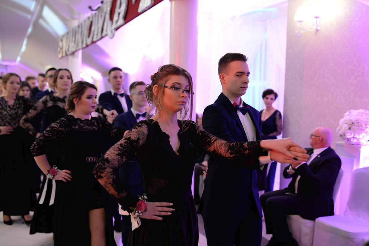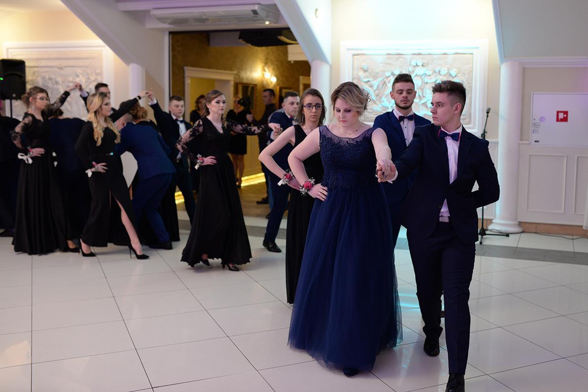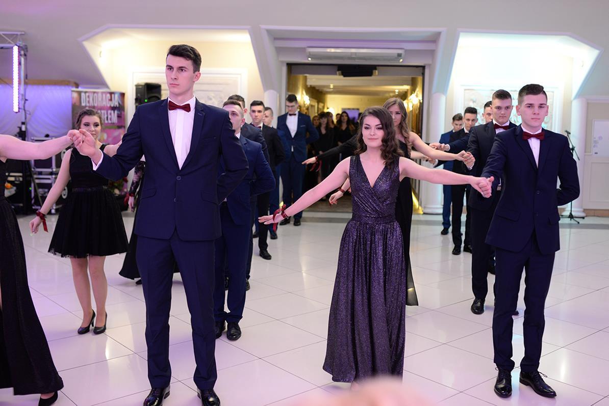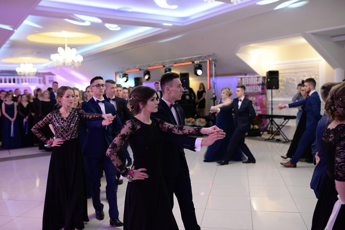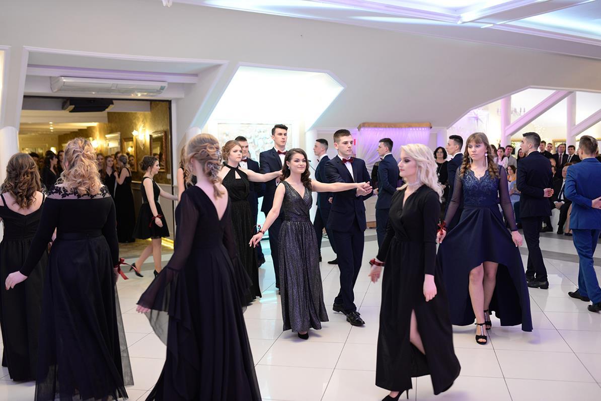 Następnie nasz narodowy taniec, wykonały wszystkie klasy maturalne. Po słowach: "Poloneza czas zacząć", kolejno klasa IIIA i VIOSSP, IIIB, IV technikum i IIIC z powagą i gracją ruszyły na parkiet. Występy wszystkich klas bardzo podobały się zgromadzonym, co zostało nagrodzone gromkimi brawami. Widać było zaangażowanie i trud, jakie młodzież włożyła w przygotowanie układów tanecznych. W tej pracy pomagała maturzystom Pani Magdalena Kujawska.