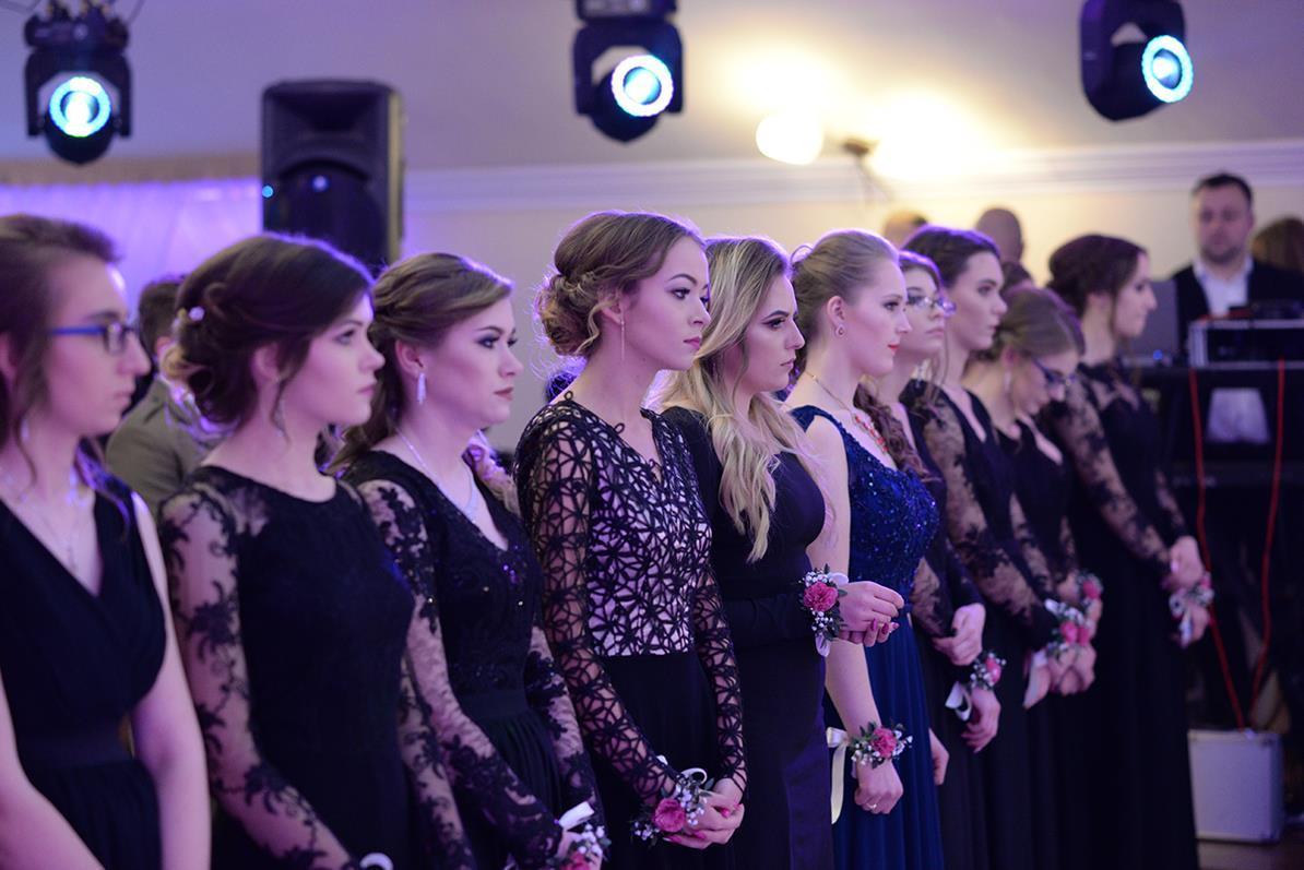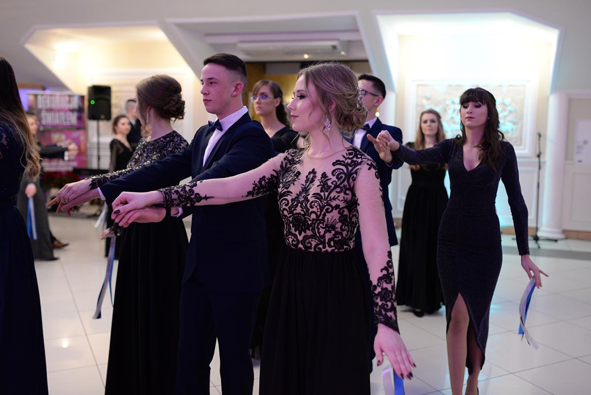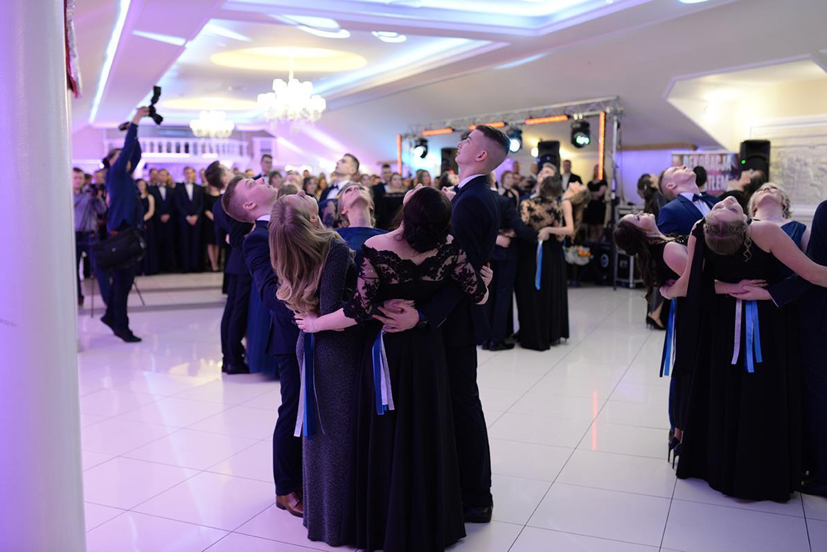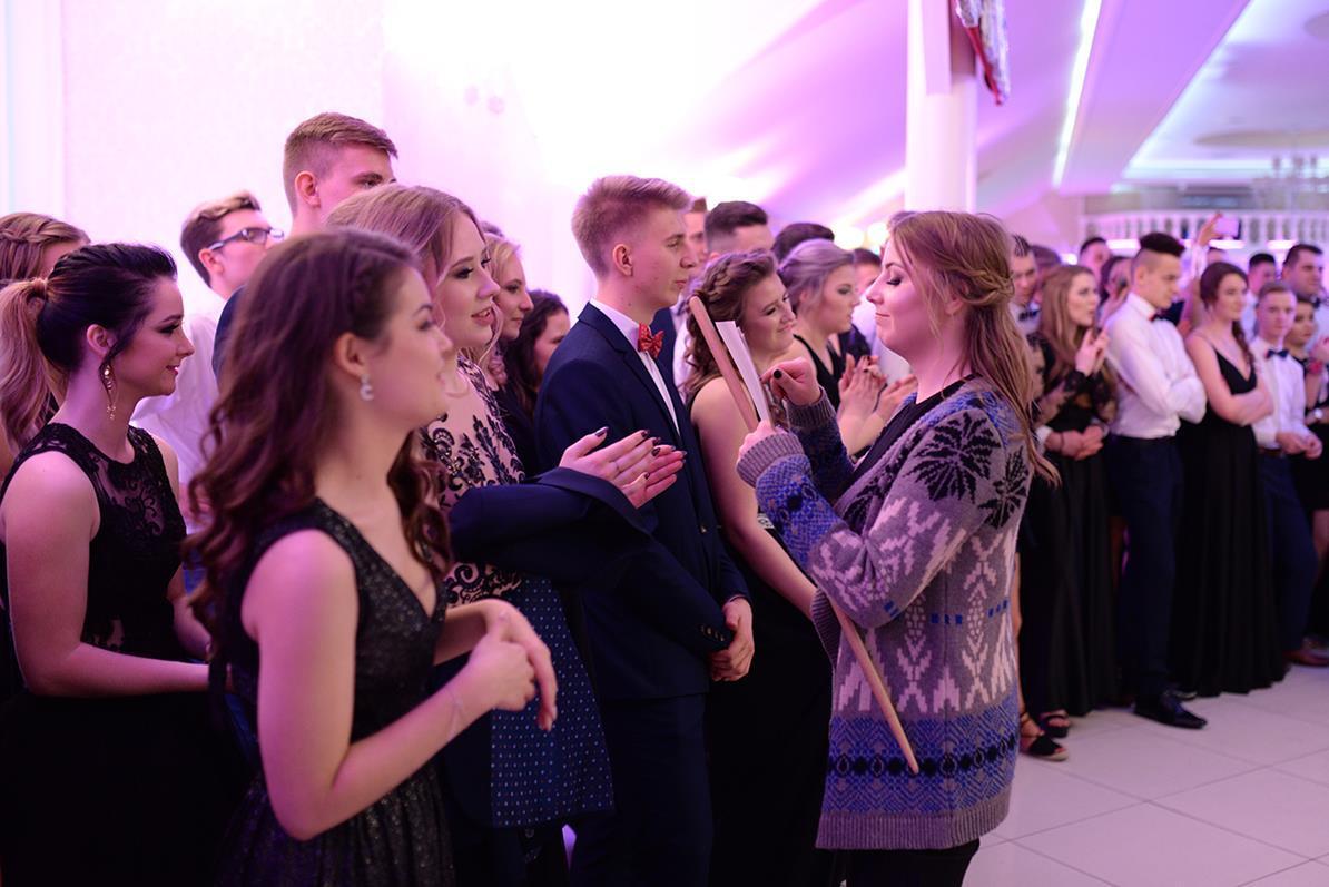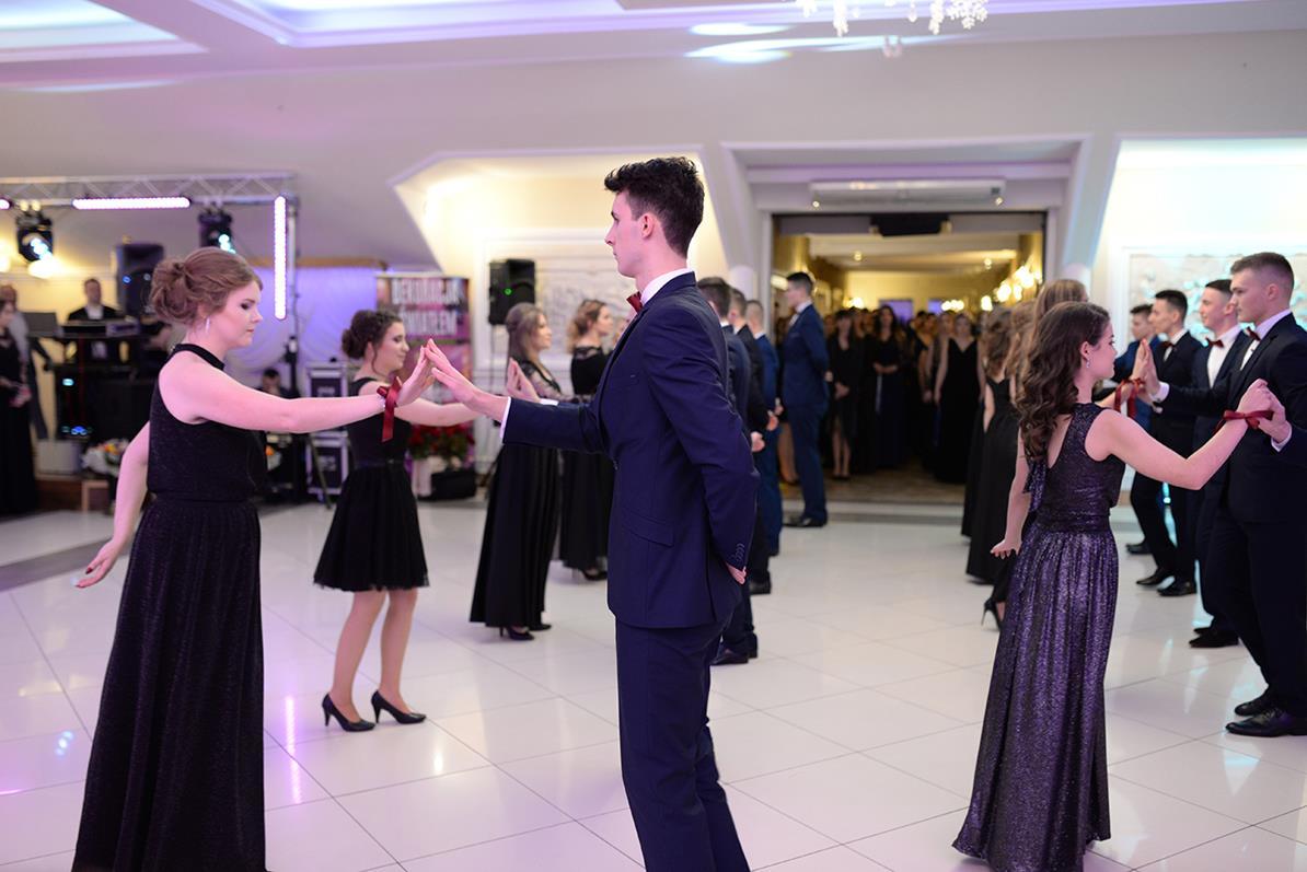 Następnie nasz narodowy taniec, wykonały wszystkie klasy maturalne. Po słowach: "Poloneza czas zacząć", kolejno klasa IIIA i VIOSSP, IIIB, IV technikum i IIIC z powagą i gracją ruszyły na parkiet. Występy wszystkich klas bardzo podobały się zgromadzonym, co zostało nagrodzone gromkimi brawami. Widać było zaangażowanie i trud, jakie młodzież włożyła w przygotowanie układów tanecznych. W tej pracy pomagała maturzystom Pani Magdalena Kujawska.