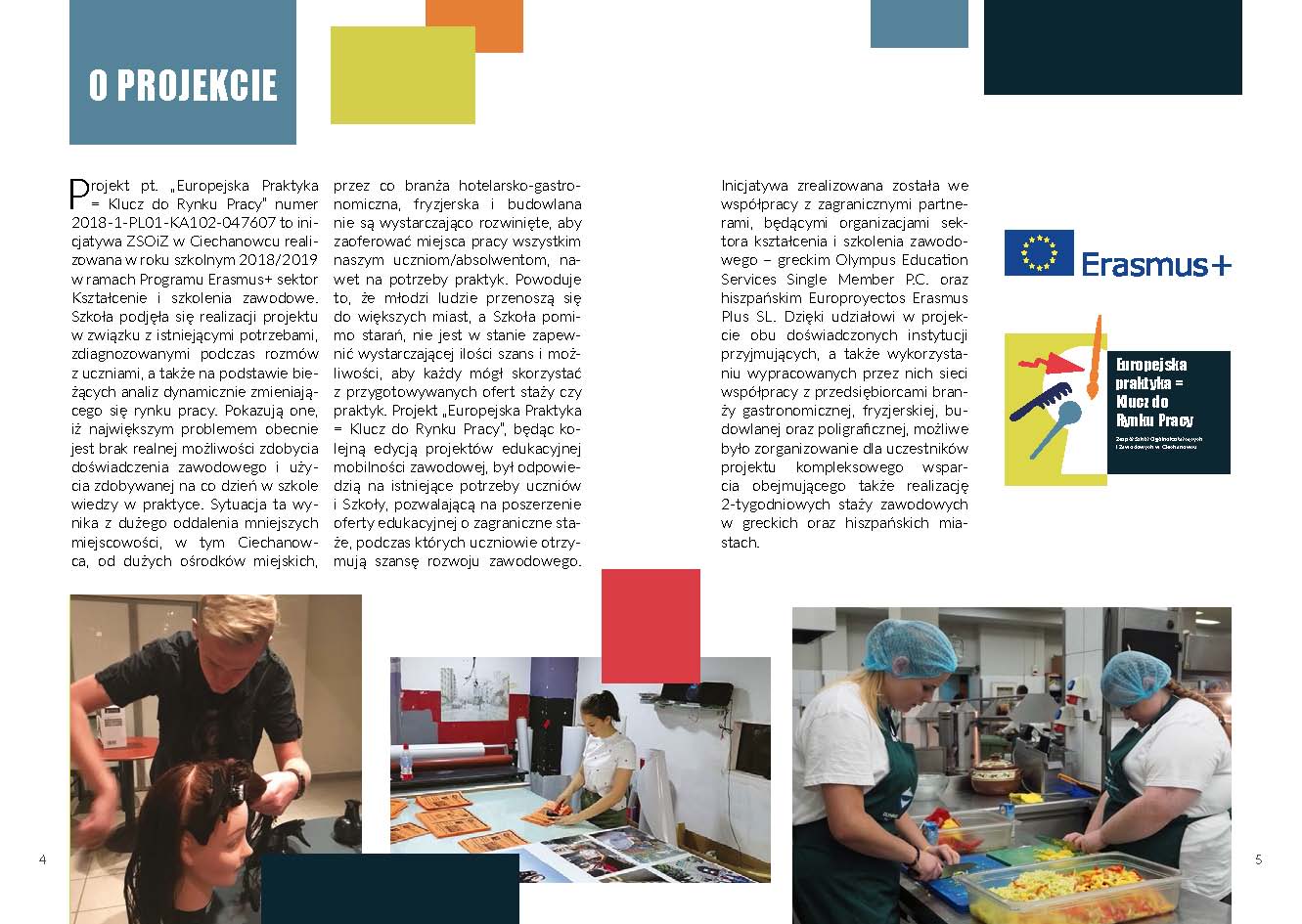 Głównym celem projektu „Europejska Praktyka = Klucz do Rynku Pracy” było podniesienie wiedzy i umiejętności zawodowych uczniów poprzez udział w dwutygodniowych zagranicznych stażach zawodowych w greckich i hiszpańskich przedsiębiorstwach.