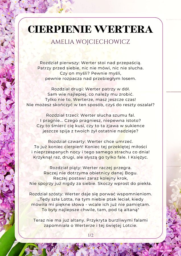 - Wyróżnienie – Amelia Wojciechowicz pseudonim Kassandra za wiersz „Cierpienie Wertera”