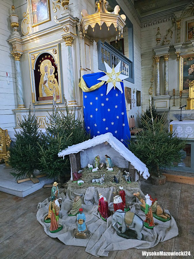 Druga szopka została umieszczona w zabytkowym kościele przeniesionym z Bogut. Na tle białych ścian świątyni i ołtarzy ustawiono klasyczną szopkę z figurami na schodach prezbiterium. Kompozycję otaczają świerkowe choinki, a nad szopką umieszczono błękitne tło z gwiazdami oraz złotą kometę.