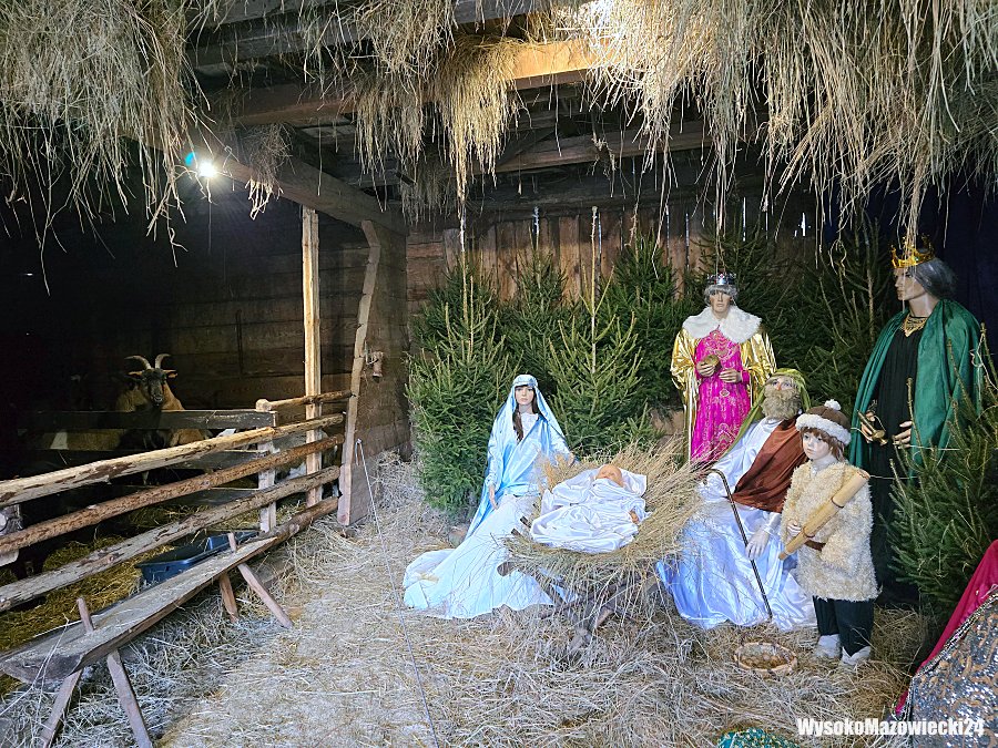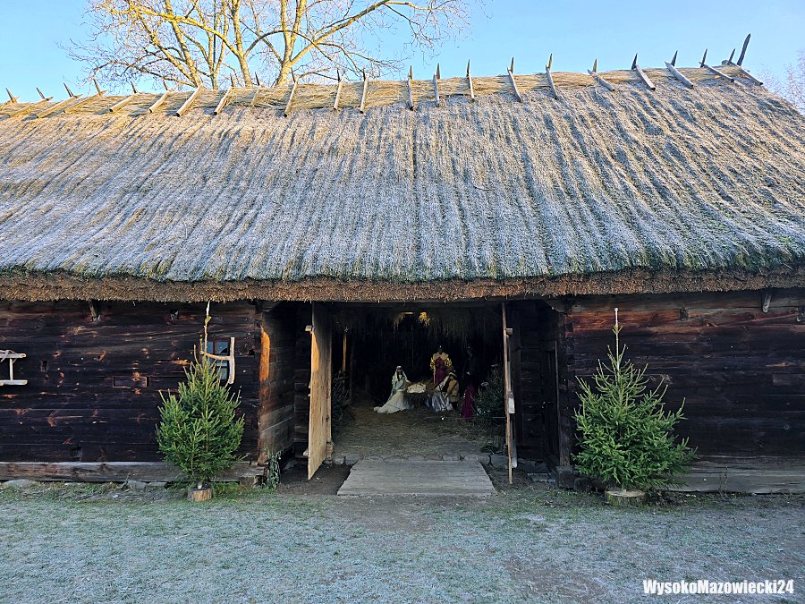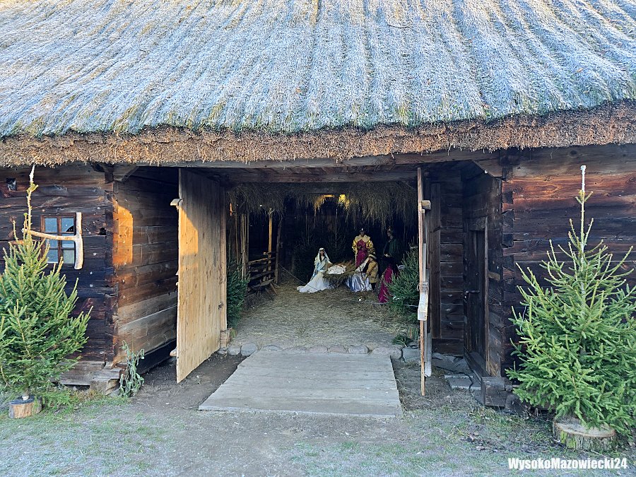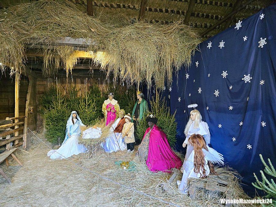 Żywa szopka została urządzona w zabytkowej stodole krytej strzechą, gdzie drewniane ściany i tradycyjna konstrukcja tworzą naturalną scenerię dla bożonarodzeniowej inscenizacji. Wewnątrz, na tle granatowego materiału ozdobionego białymi płatkami śniegu, ustawiono figury w barwnych strojach. Maryja, Józef, Trzej Królowie oraz anioły w białych sukniach tworzą nastrojową scenę Narodzenia Pańskiego. Wokół nich rozstawiono świerkowe choinki, a całość oświetlono tak, by podkreślić uroczysty charakter przestrzeni.
