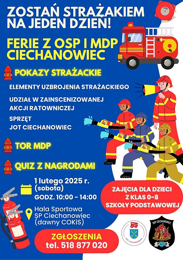 Spotkanie organizowane we współpracy z Ochotniczą Strażą Pożarną i Młodzieżową Drużyną Pożarniczą w Ciechanowcu, podczas którego uczestnicy będą mieli możliwość poznać specyfikę pracy strażaka.