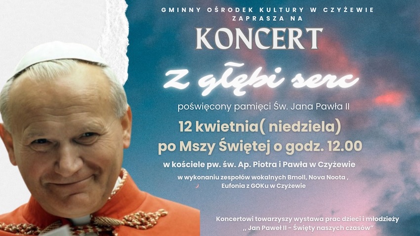 Gminny Ośrodek Kultury w Czyżewie zaplanował na najbliższą niedzielę, 12 kwietnia, koncert zatytułowany „Z głębi serc”. Wydarzenie jest poświęcone pamięci św. Jana Pawła II i odbędzie się w kościele pw. św. Apostołów Piotra i Pawła.