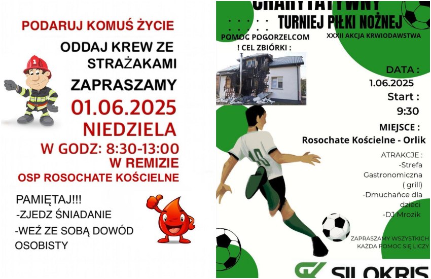 Ochotnicza Straż Pożarna Rosochate Kościelne przygotowała na 1 czerwca 2025 roku podwójne wydarzenie pomocowe. Mieszkańcy gminy będą mogli wziąć udział w XXXII akcji krwiodawstwa oraz charytatywnym turnieju piłki nożnej, którego celem jest pomoc pogorzelcom z Czyżewa.