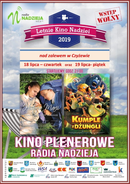Gminny Ośrodek Kultury w Czyżewie serdecznie zaprasza nad zalew na kino plenerowe "Radia Nadzieja". Projekcje o godzinie 21:00 odbędą się w dniach 18 i 19 lipca (czwartek, piątek). Wstęp bezpłatny.