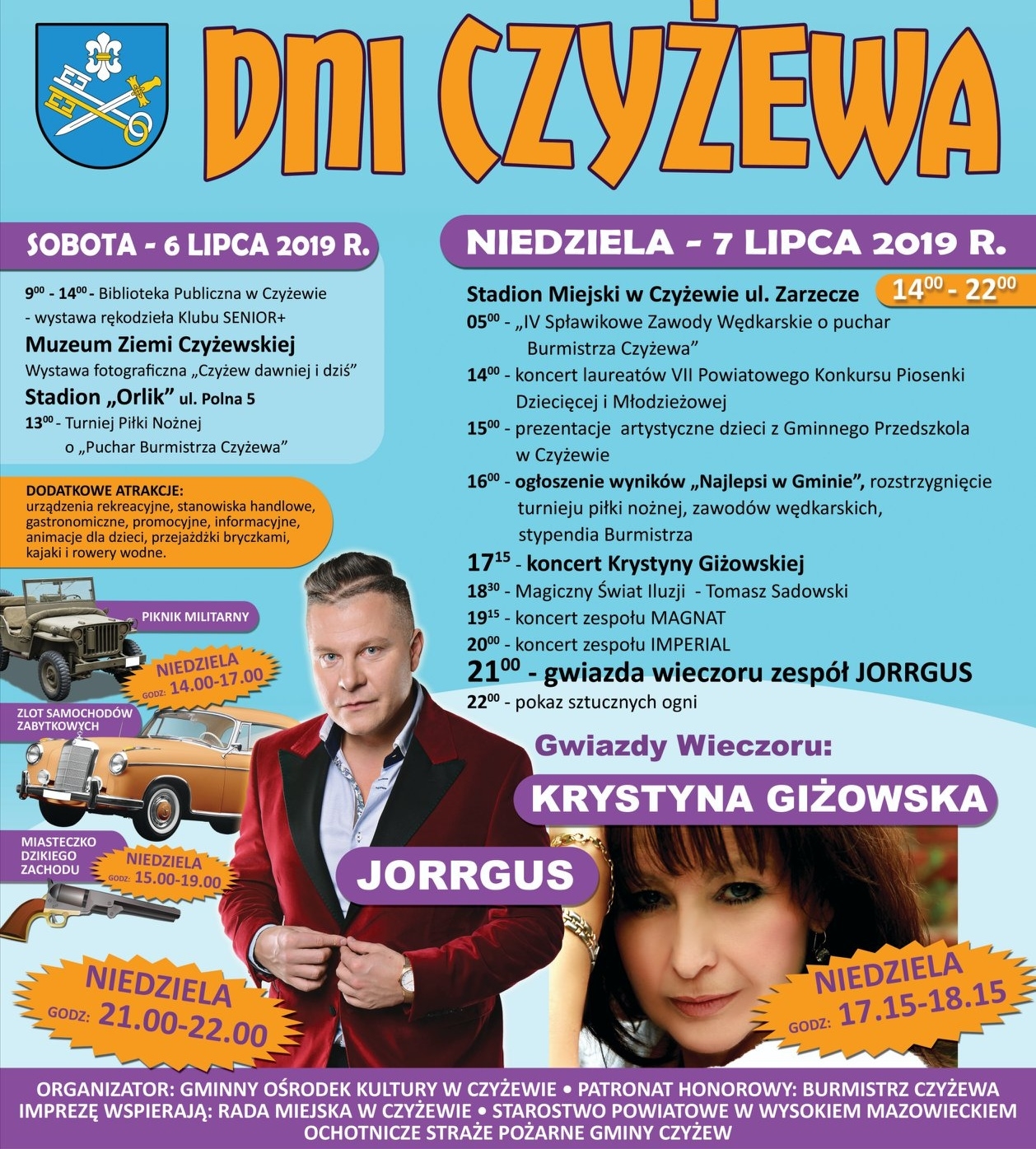 Konkursy, zlot zabytkowych samochodów, piknik militarny, turnieje piłki nożnej, zawody wędkarskie, występy artystyczne oraz koncerty m.in.Krystyny Giżowskiej oraz gwiazdy wieczoru zespołu Jorrgus – te i wiele innych atrakcji czekają na wszystkich, którzy w dniach 6 i 7 lipca odwiedzą Czyżew. Patronat medialny nad imprezą objął portal wysokomazowiecki24.