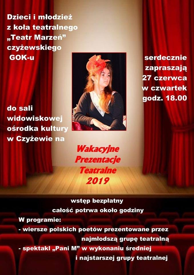 Dzieci i Młodzież z "Teatru Marzeń" czyżewskiego GOK-u zapraszają w czwartek (27.06)na godz. 18.00 do Gminnego Ośrodka Kultury w Czyżewie na "Wakacyjne Prezentacje Teatralne". Wstęp bezpłatny.