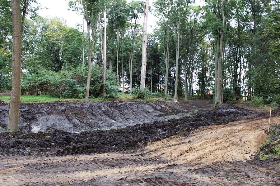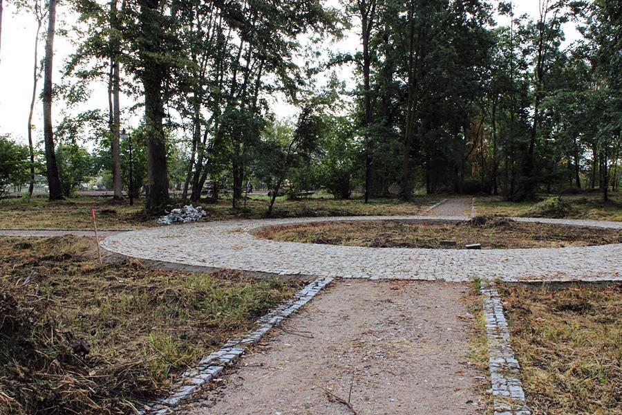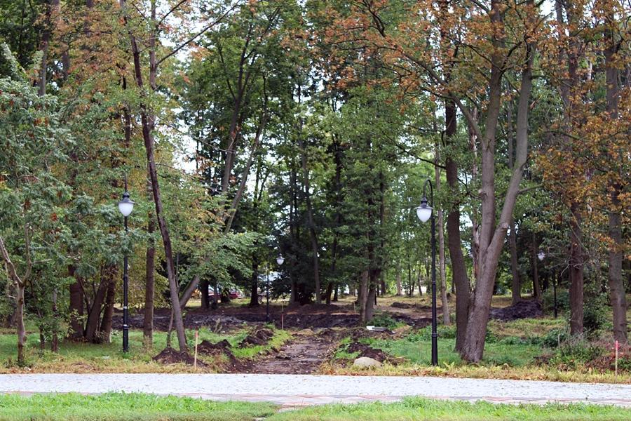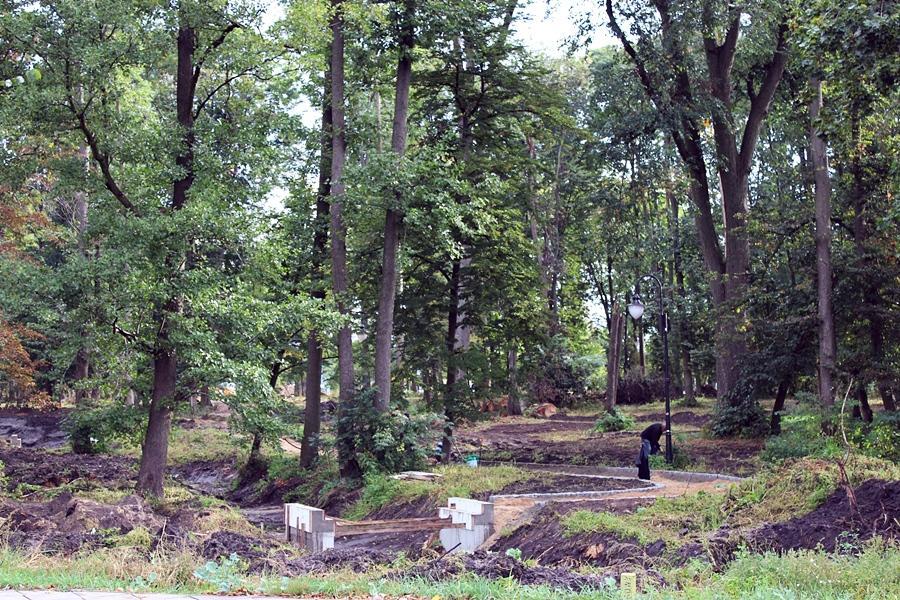 Równolegle z pracami budowlanymi tj. budową alejek, mostków, pergoli i altany prowadzane są prace przez firmę Wiewiórka Dariusz Chotyński, której zadaniem jest pielęgnacja drzewostanu, nasadzenia roślin i krzewów ozdobnych oraz założenia trawników.