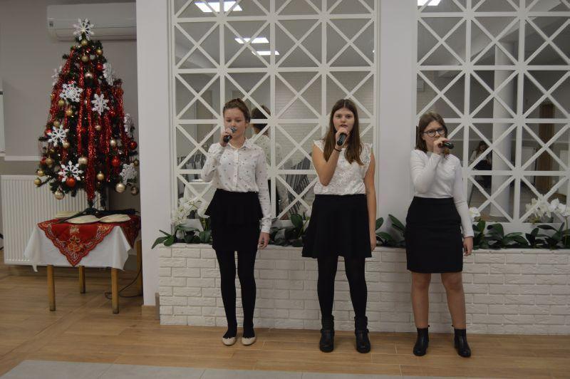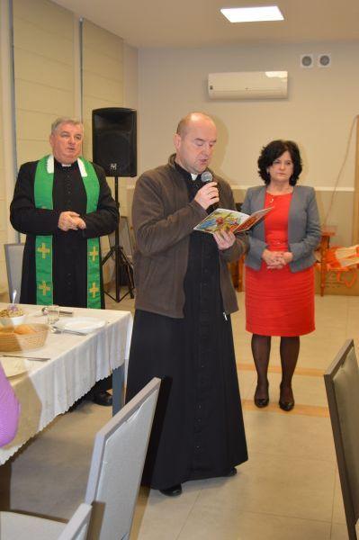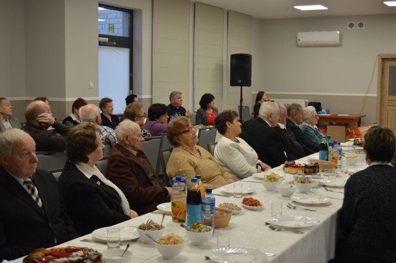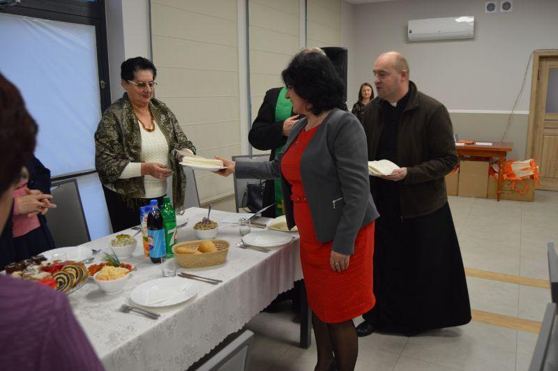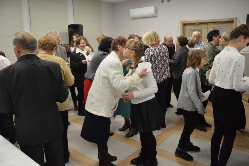 Po wspólnym kolędowaniu Ks. Proboszcz Eugeniusz Sochacki odczytał Ewangelię i przypomniał wszystkim jak ważne i piękne są święta przepełnione miłością, radością i pokojem, a zwłaszcza spędzone w gronie najbliższych. Po tych słowach nastąpiło dzielenie się opłatkiem, wszyscy składali sobie życzenia pełne serdeczności i uśmiechu, wszystkich zebranych ogarnął prawdziwie świąteczny nastrój. Na wspólnej wigilii nie zabrakło tradycyjnych przysmaków świątecznej kuchni.