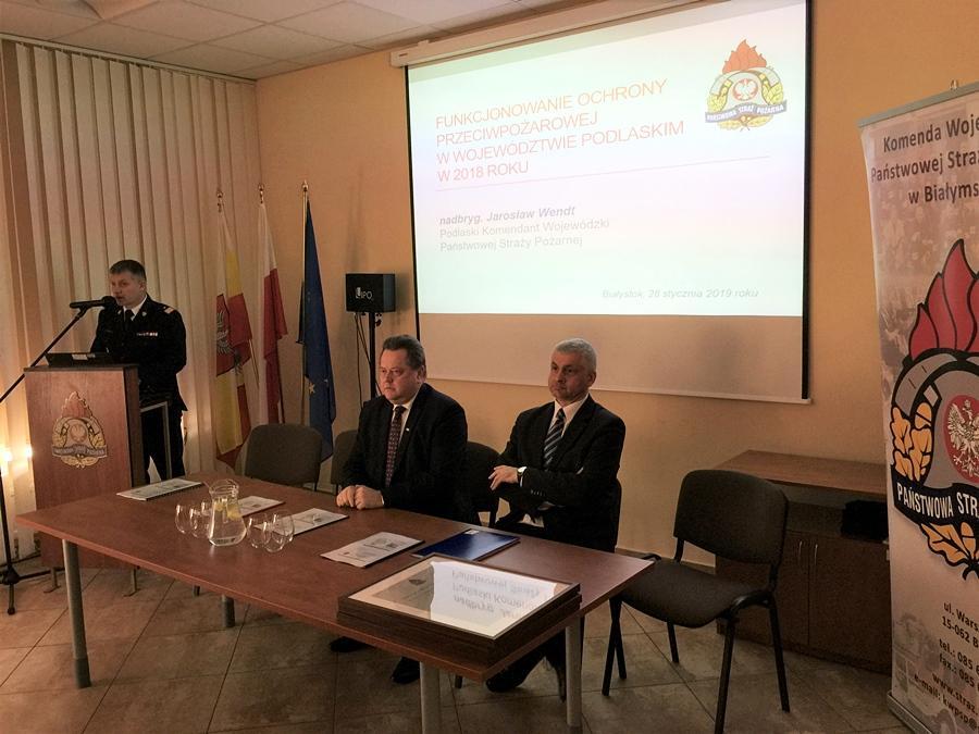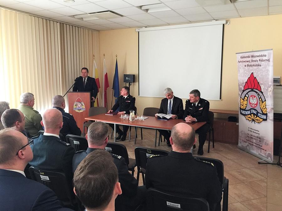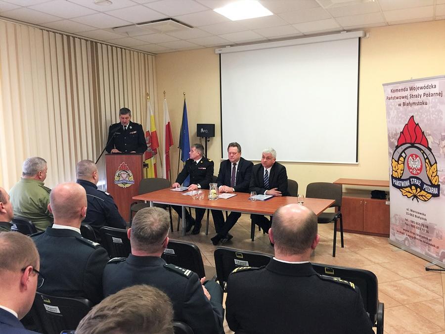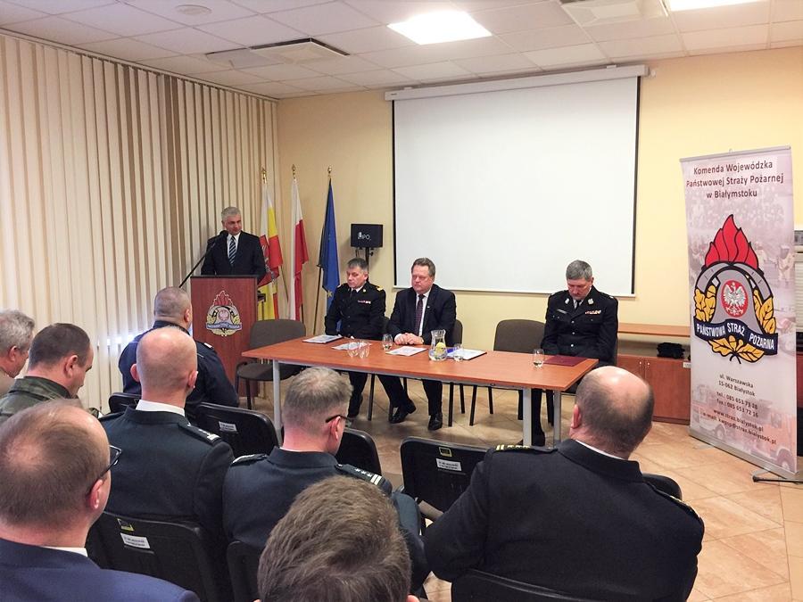 28 stycznia br. w siedzibie Podlaskiego Oddziału Straży Granicznej w Białymstoku odbyła się narada podsumowująca funkcjonowanie ochrony przeciwpożarowej województwa podlaskiego w 2018 roku z udziałem Jarosława Zielińskiego Wiceministra Spraw Wewnętrznych i Administracji, Posła na Sejm Rzeczypospolitej Polskiej i Bohdana Paszkowskiego Wojewody Podlaskiego. W naradzie udział wzięła kadra kierownicza Państwowej Straży Pożarnej województwa podlaskiego, dowódcy JGR, naczelnicy KW PSP w Białymstoku i prezesi powiatowi Związku Ochotniczych Straży Pożarnych na czele z Druhem Andrzejem Kocem Prezesem Zarządu Oddziału Wojewódzkiego Związku Ochotniczych Straży Pożarnych Rzeczypospolitej Polskiej, a także zaproszeni goście.