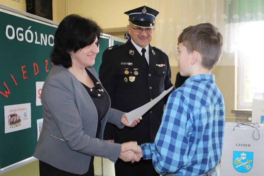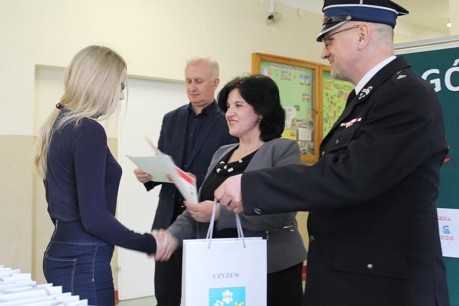 Nagrody uczniom wręczyła Burmistrz Czyżewa Anna Bogucka (Prezes Zarządu Oddziału Gminnego ZOSP RP), Komendant Gminny ZOSP w Czyżewie Dariusz Sienicki oraz Wicedyrektor Szkoły Radosław Sienicki.