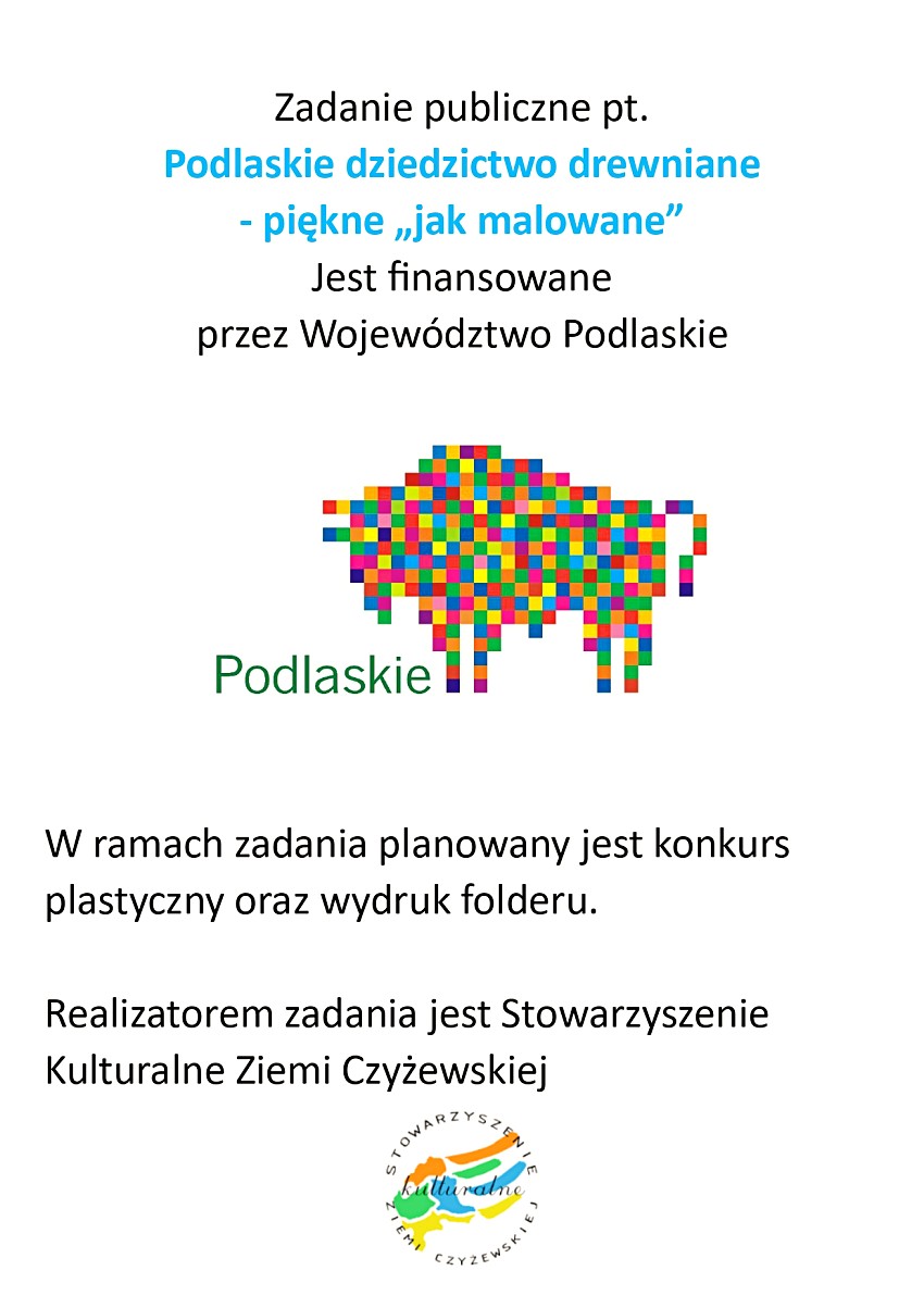 Portal WysokoMazowiecki24.pl objął patronatem medialnym niezwykłe wydarzenie kulturalne organizowane w gminie Czyżew. Stowarzyszenie Kulturalne Ziemi Czyżewskiej zaprasza do udziału w konkursie plastycznym "Podlaskie dziedzictwo drewniane - piękne jak malowane".