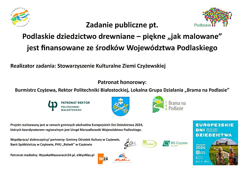 Patronat honorowy nad wydarzeniem objęli burmistrz Czyżewa, rektor Politechniki Białostockiej oraz Lokalna Grupa Działania "Brama na Podlasie". Projekt jest finansowany ze środków Województwa Podlaskiego.