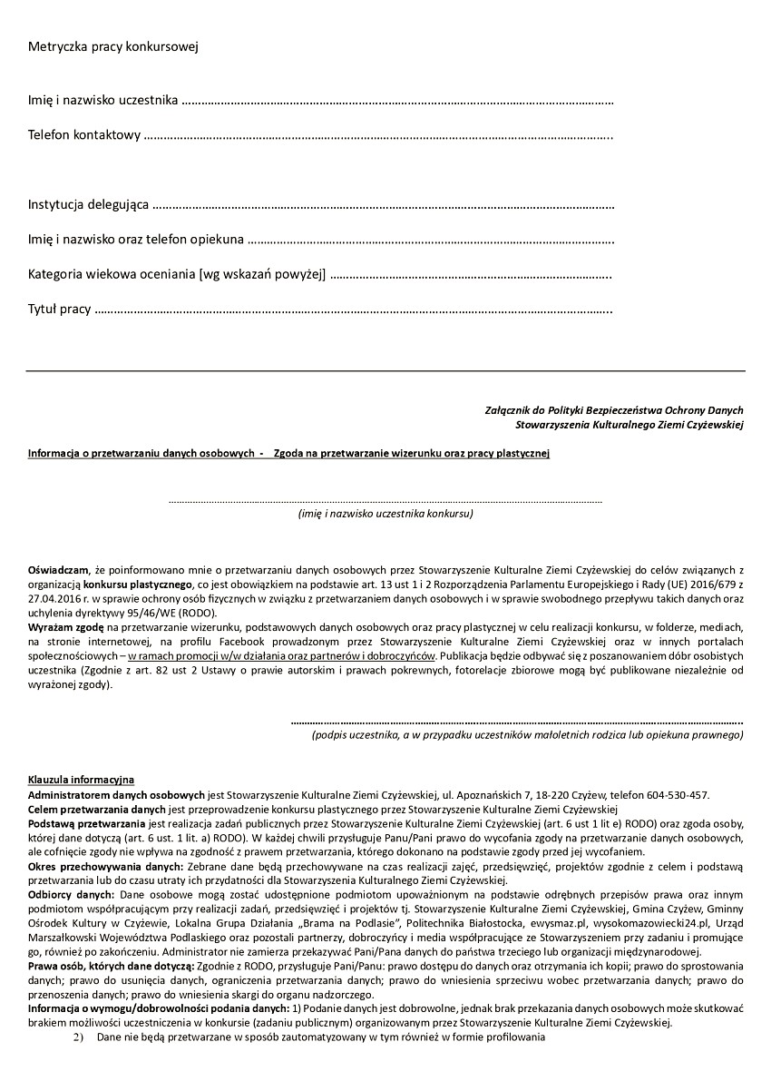 Ważną informacją dla uczestników jest termin dostarczenia prac. Gotowe dzieła należy dostarczyć do Gminnego Ośrodka Kultury w Czyżewie najpóźniej do piątku 6 września do godziny 16:00. Przy zgłaszaniu prac należy podać kategorię wiekową sprzed wakacji.