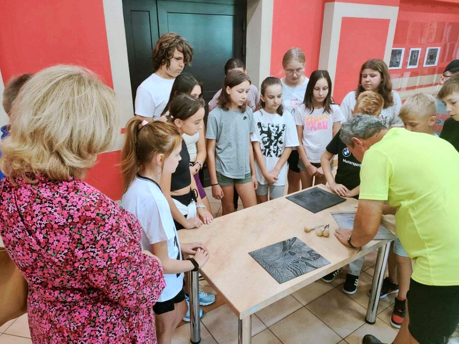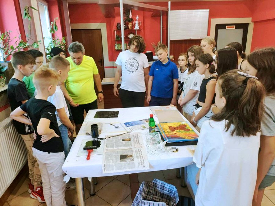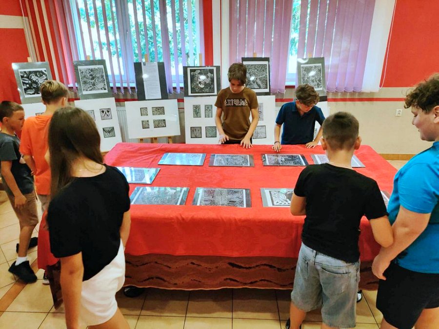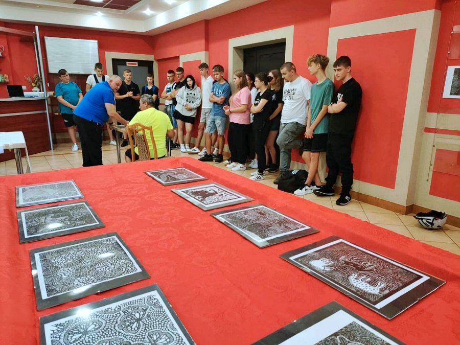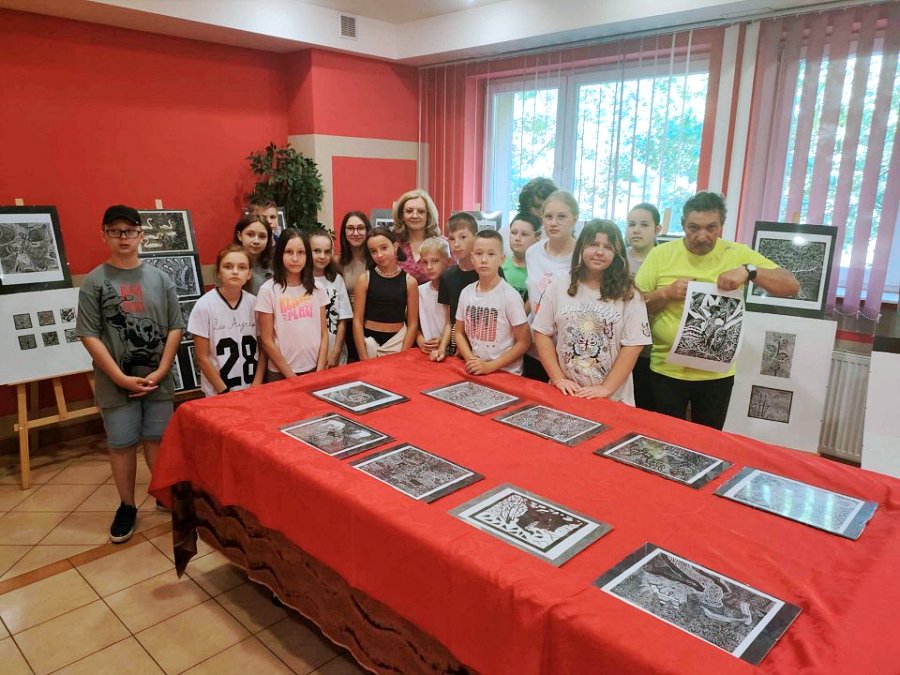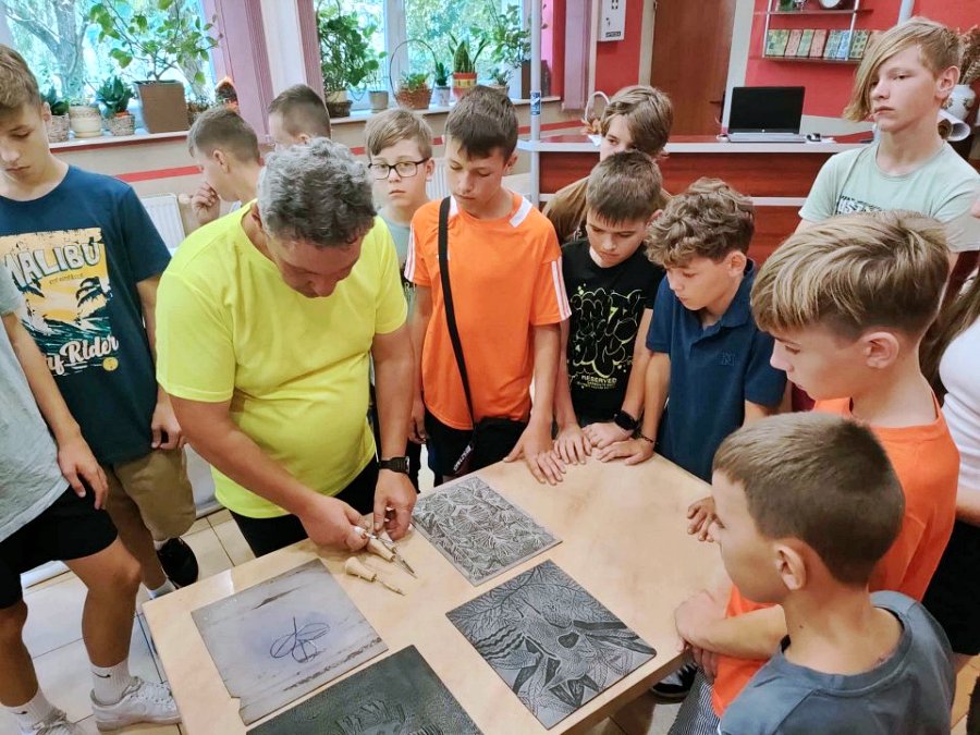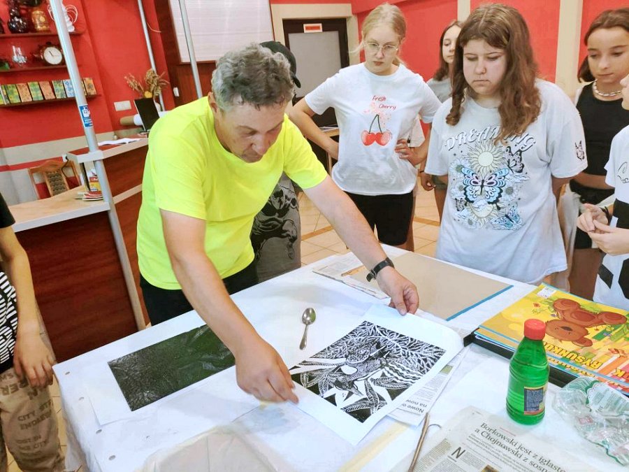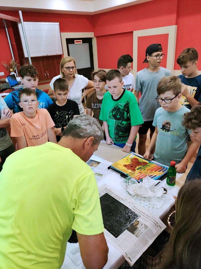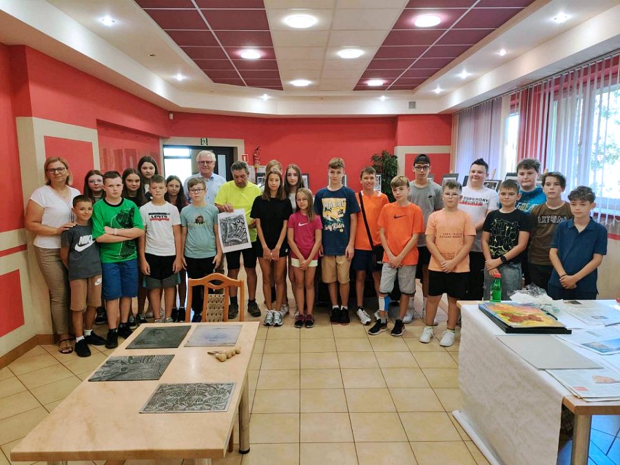Wydarzenie zorganizowano w ramach trwającej od 21 sierpnia wystawy prac artysty, która jest dostępna dla zwiedzających w "kawiarence" GOK-u do 11 września. Jednak dzisiejsze spotkanie miało charakter szczególny - młodzi uczestnicy mogli nie tylko obejrzeć gotowe dzieła, ale także na żywo obserwować proces powstawania linorytu.