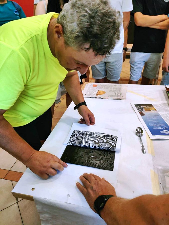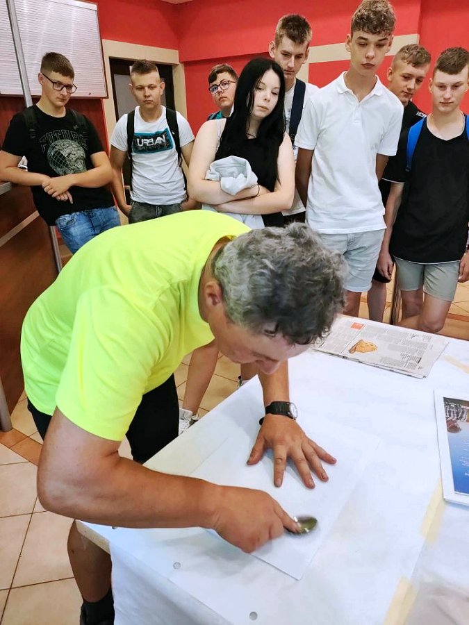Marek Turkot, znany ze swojego talentu i umiejętności w dziedzinie grafiki artystycznej, zaprezentował młodzieży kolejne etapy tworzenia linorytu. Uczniowie z zaciekawieniem obserwowali, jak pod wprawną ręką artysty zwykła płytka linoleum zamienia się w matrycę, z której później powstaje unikatowy odbitka.
