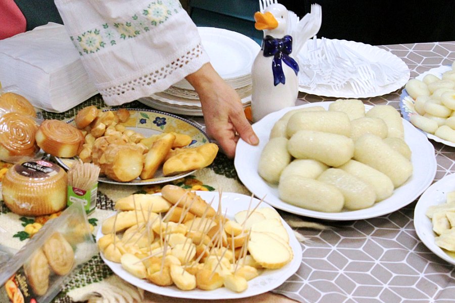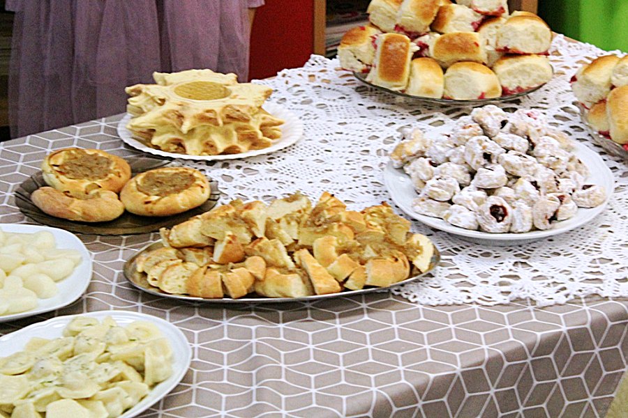 Szkolne kucharki oraz rodzice przygotowali bogaty wybór tradycyjnych potraw. Na stołach znalazły się polskie specjały: kartacze, kluski śląskie i sękacze oraz ukraińskie przysmaki: pielmeni i drożdżowe kruche różyczki z wiśniami. Każdą potrawę prezentowały osoby ubrane w regionalne stroje, opowiadając o składnikach i metodach przygotowania dań.
