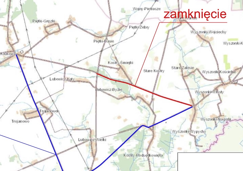 Od 4 czerwca do 31 sierpnia 2025 roku droga powiatowa nr 2087B na odcinku Kostry Śmiejki - Wyszonki Wypychy będzie całkowicie zamknięta dla ruchu. Powodem utrudnień są planowane prace remontowe realizowane przez Przedsiębiorstwo Robót Drogowo-Mostowych „MIKST" Sp. z o.o. na zlecenie Zarządu Dróg Powiatowych w Wysokiem Mazowieckiem.