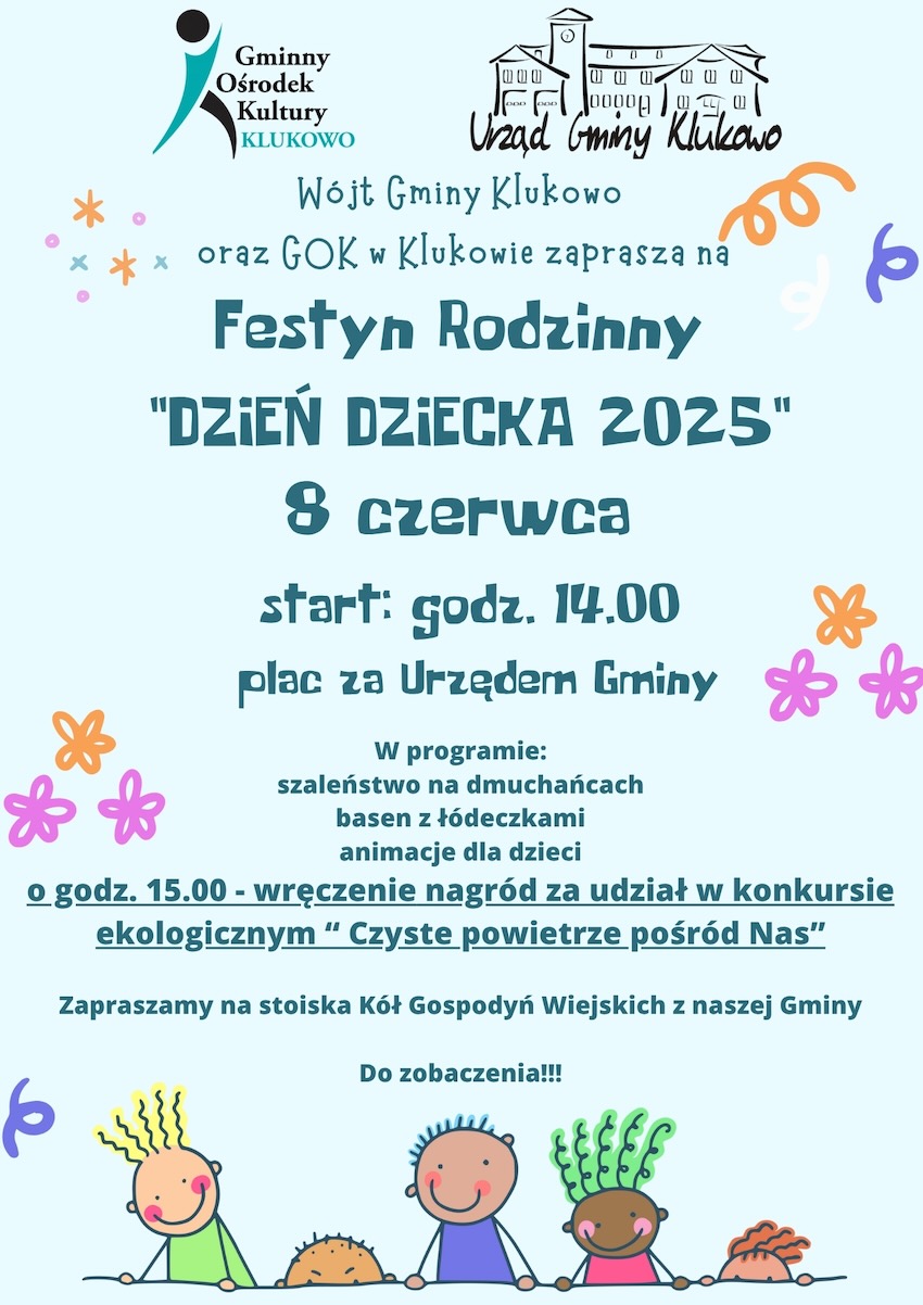 Wójt Gminy Klukowo oraz Gminny Ośrodek Kultury w Klukowie zapraszają mieszkańców na Festyn Rodzinny "Dzień Dziecka 2025". Wydarzenie odbędzie się 8 czerwca o godzinie 14:00 na placu za Urzędem Gminy.