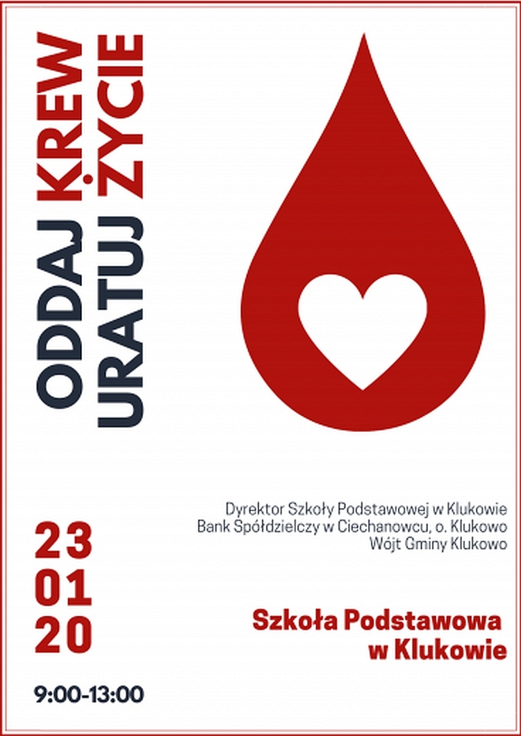 Dyrektor Szkoły Podstawowej w Klukowie, Wójt Gminy Klukowo oraz Dyrektor Banku Spółdzielczego w Klukowie zapraszają na akcję krwiodawstwa pn. „Oddaj krew – uratuj życie”.