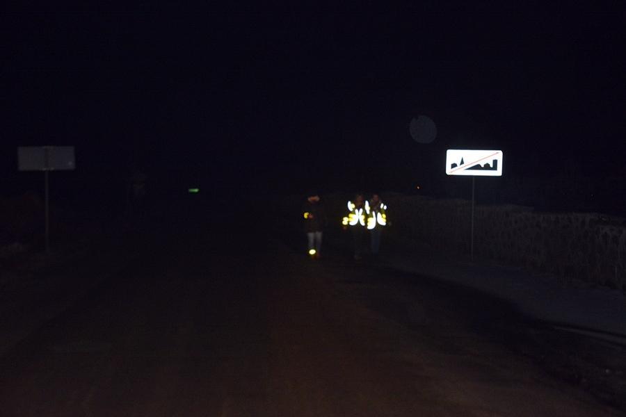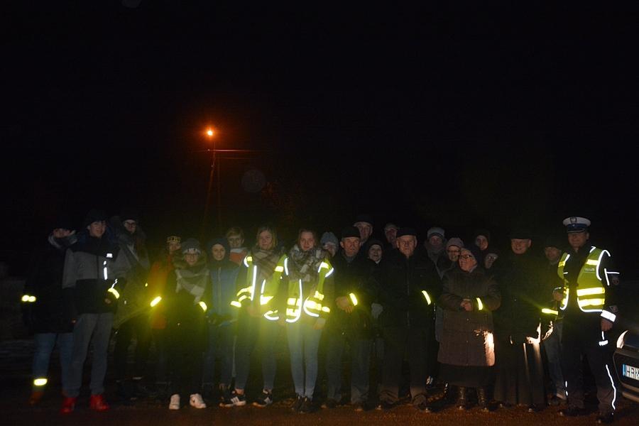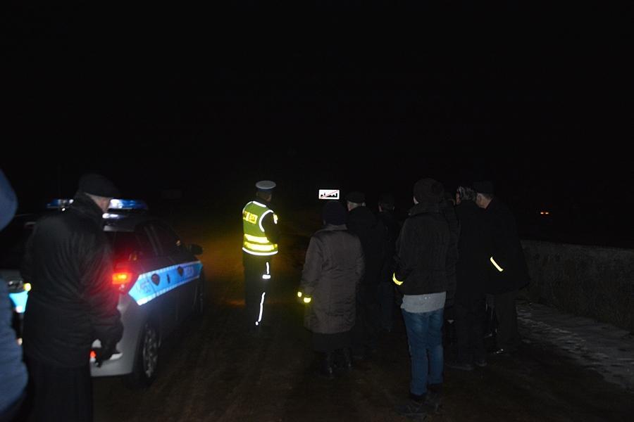 Wieczór oraz ciemna nieoświetlona droga przed miejscowością Wyszonki Kościelne. Właśnie tam wysokomazowieccy policjanci zaprezentowali mieszkańcom jaką rolę odgrywają elementy odblaskowe w zapewnieniu bezpieczeństwa pieszym.