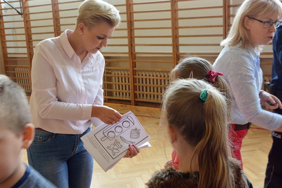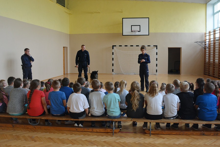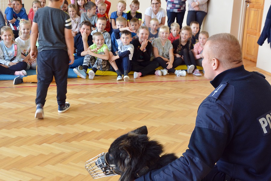 Największym zainteresowaniem dzieci cieszył się jednak pies służbowy - Borys, który zaprezentował uczniom swoje umiejętności. Policjant - przewodnik w sposób bardzo ciekawy opowiedział o tym, jak wygląda jego codzienna służba z czworonożnym partnerem, a także tłumaczył jak zachowywać się wobec agresywnego psa.