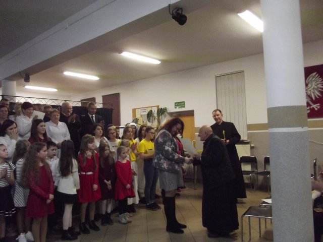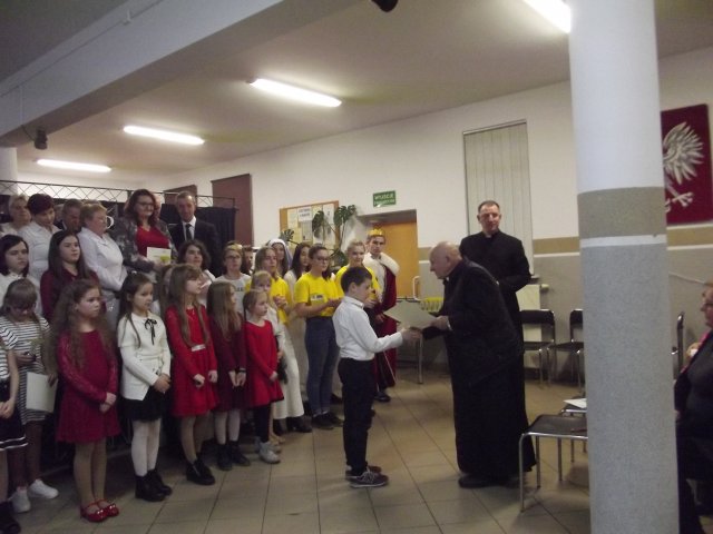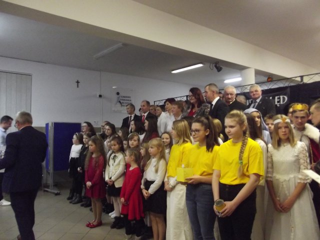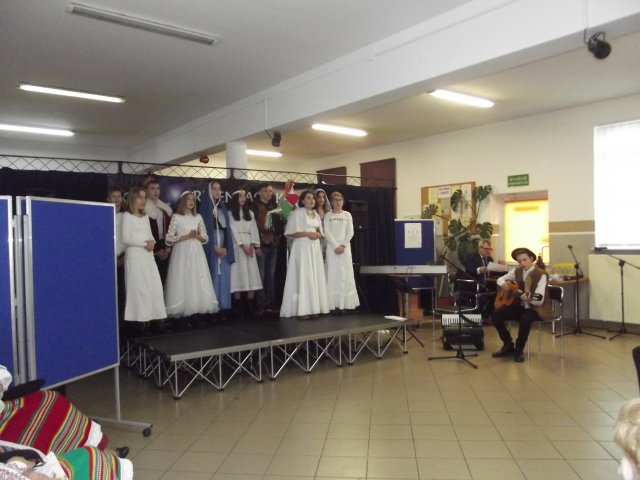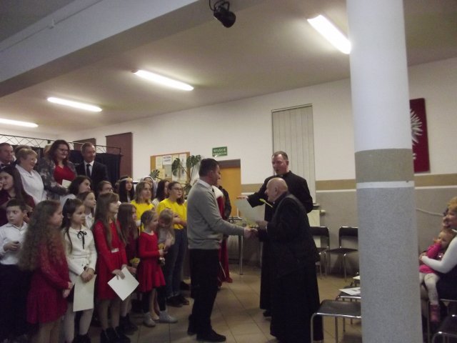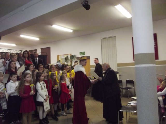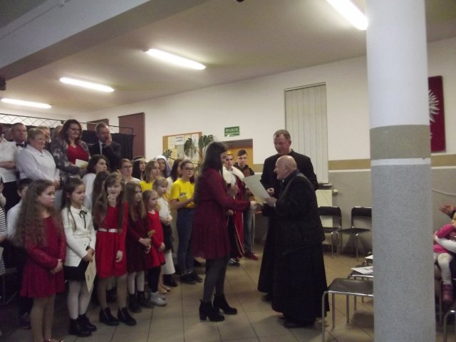 Na scenie obejrzeliśmy jasełka w wykonaniu wolontariuszy ze Szkoły Podstawowej w Klukowie, którzy od kilku dni odwiedzali z gwiazdą domy w Klukowie i Sobolewie wystawiając jasełka i prowadząc zbiórkę funduszy na pomoc dla dzieci z chorobami nowotworowymi przebywającymi w białostockim hospicjum dziecięcym. Dzięki ich staraniom Fundacja „Pomóż im” wzbogaciła się o 3780,50 zł. z kolędowania po domach oraz 602 zł. ze zbiórki w trakcie Prezentacji. Wielki szacunek dla Koła Wolontariatu!