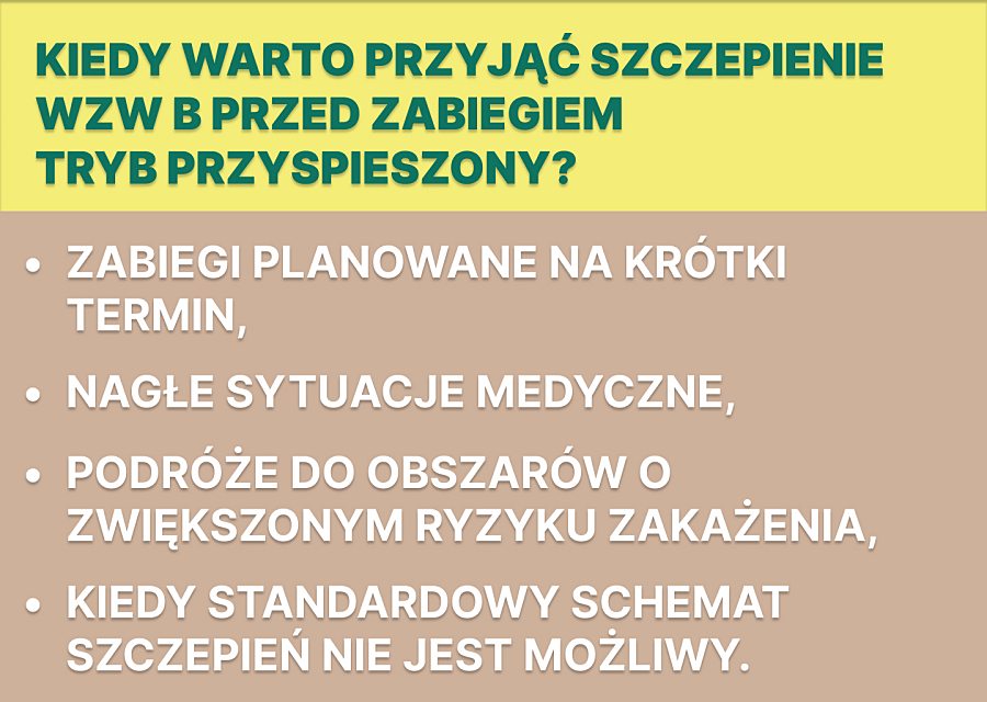zabiegi planowane na krótki termin – gdy termin zabiegu jest bliski, a standardowy schemat szczepień nie pozwala na uzyskanie pełnej ochrony przed rozpoczęciem procedury, tryb przyspieszony może być rozważany. W takich przypadkach podjęcie decyzji o przyjęciu szczepienia powinno być skonsultowane z lekarzem prowadzącym,