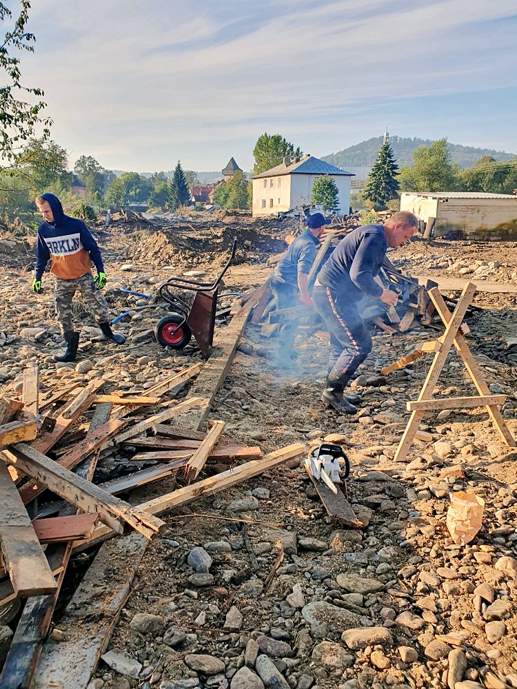 Strażacy ochotnicy z gminy Klukowo, którzy wyruszyli na pomoc powodzianom, dotarli na miejsce akcji w miejscowości Żelazno. Już pierwszego dnia druhowie ciężko pracowali, usuwając skutki powodzi na zalanych terenach.