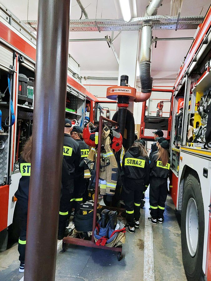 St.ogn. Łukasz Antoniak przeprowadził dla młodych druhów szczegółową prezentację obiektu, pokazując sprzęt ratowniczo-gaśniczy oraz pomieszczenia, z których na co dzień korzystają zawodowi strażacy. Młodzież mogła zobaczyć m.in. garaże ze specjalistycznymi pojazdami pożarniczymi oraz zaplecze techniczne jednostki.
