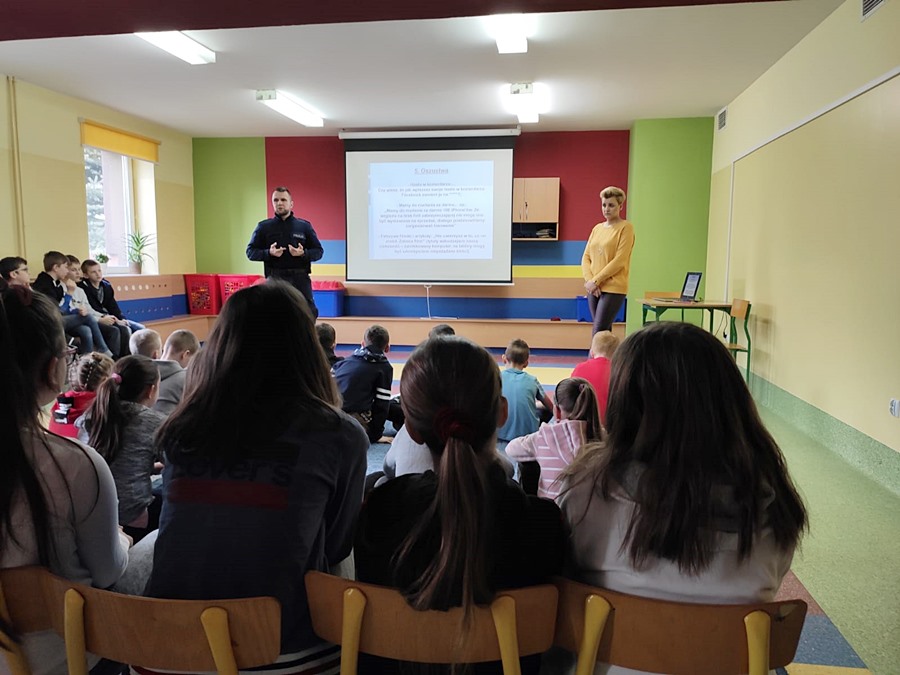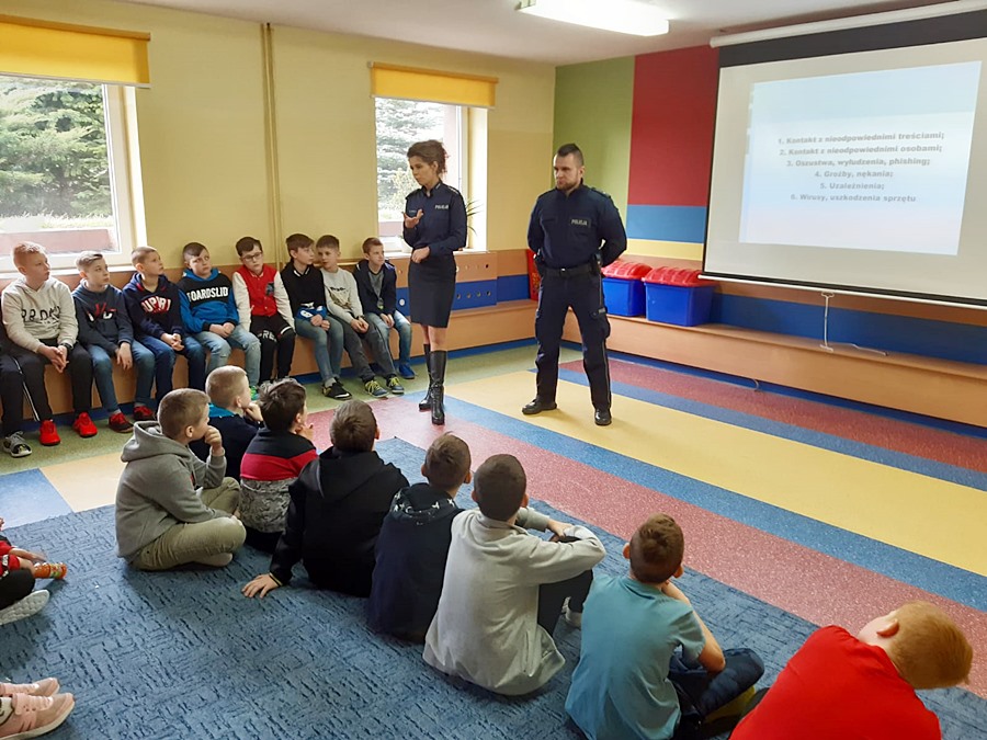 Dzielnicowy z Posterunku Policji w Sokołach oraz przedstawicielki wysokomazowieckiej Policji spotkali się dzisiaj z uczniami klas IV – VI Szkoły Podstawowej w Kobylinie Borzymach. Podczas zajęć prelegenci zaznaczyli, że już jutro obchodzony jest Dzień Bezpiecznego Internetu. Dzielnicowy podkreślił, że internet zapewnia wspaniałe możliwości do nauki i zabawy, ale nadmienił, że warto pamiętać o zagrożeniach, jakie są z nim związane. Przedstawiono takie niebezpieczeństwa jak: cyberprzemoc, niebezpieczne kontakty, szkodliwe treści, zagrożenie prywatności, przestępstwa internetowe, m.in. kradzież danych oraz problem uzależnienia od internetu. Wyjaśniono zagrożenia i przedstawiono sposoby na ich zapobieganie. Podkreślono, że ofiary lub świadkowie cyberprzemocy powinny szukać wsparcia – porozmawiać z rodzicami, pedagogiem, wychowawcą, bądź inną osobą dorosłą. Razem łatwiej rozwiązać problem. Spotkanie było doskonałą okazją do tego, aby usystematyzować młodym ludziom ich wiedzę tak, żeby mogli bezpiecznie "poruszać się w sieci".