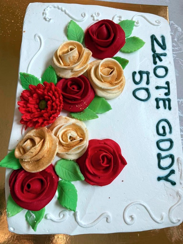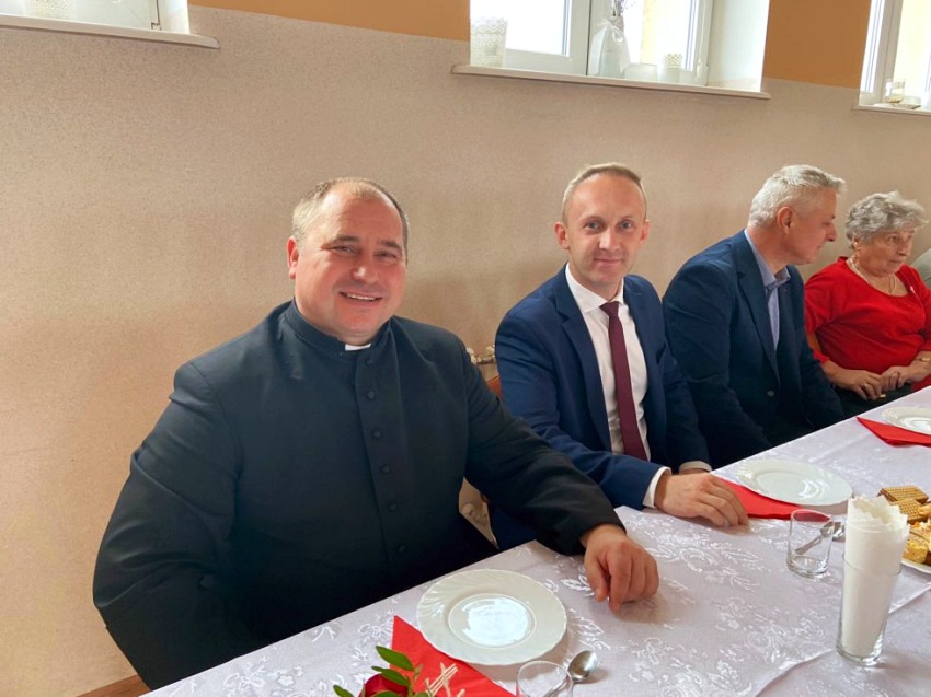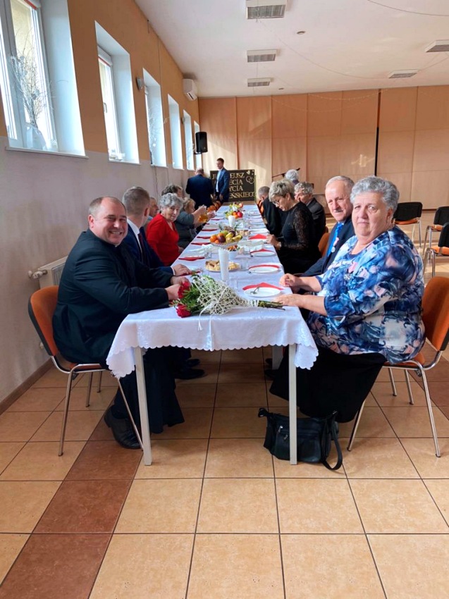 W dalszej części uroczystości małżonkowie obchodzący jubileusz Złotych Godów, Ksiądz Proboszcz Krzysztof Konopka i zaproszeni goście usiedli wspólnie do słodkiego poczęstunku. Tej niecodziennej i podniosłej atmosferze towarzyszyło dużo ciepłych słów, życzenia, kwiaty, listy gratulacyjne i skromne upominki.