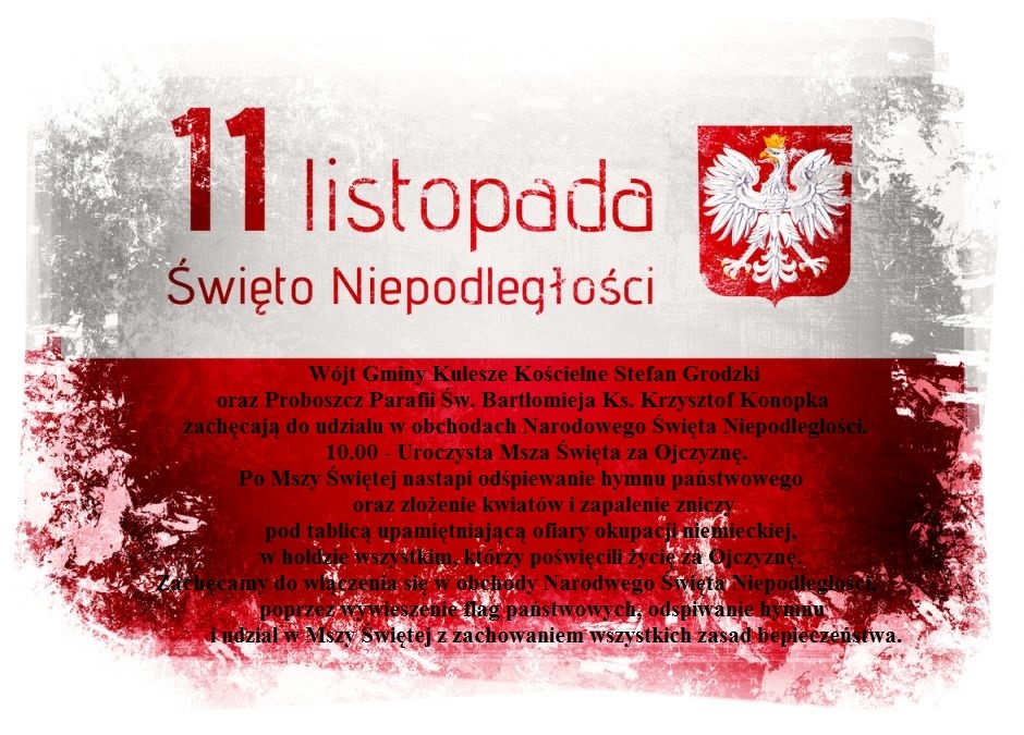 Wójt Gminy Kulesze Kościelne Stefan Grodzki oraz Proboszcz Parafii Św. Bartłomieja Ks. Krzysztof Konopka zachęcają do udziału w obchodach Narodowego Święta Niepodległości.