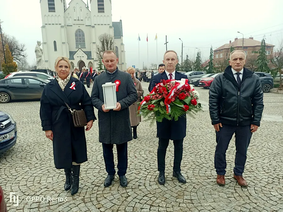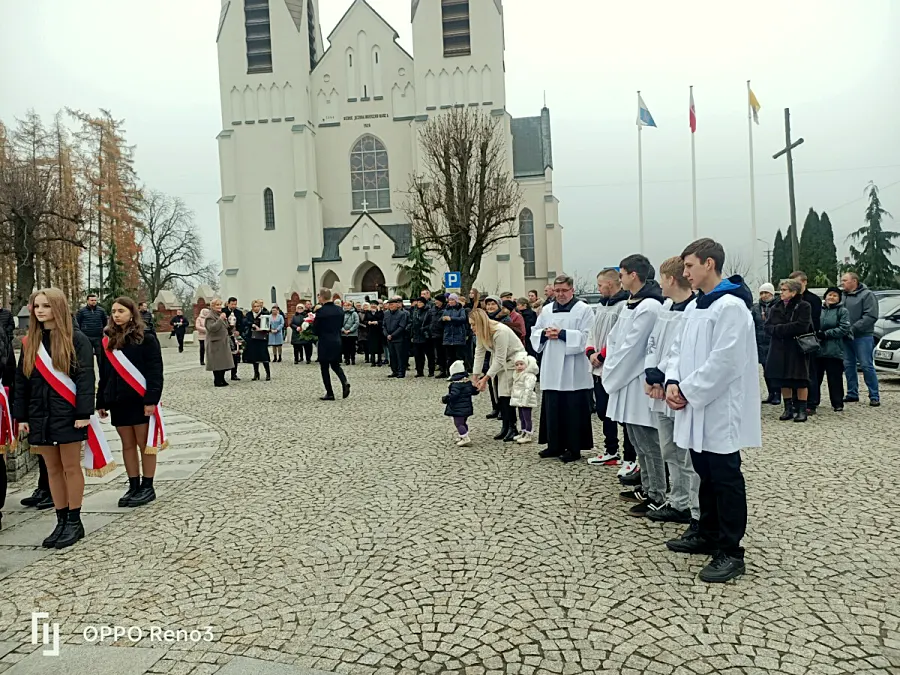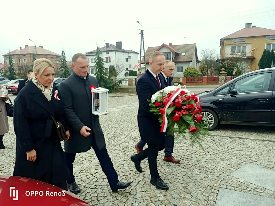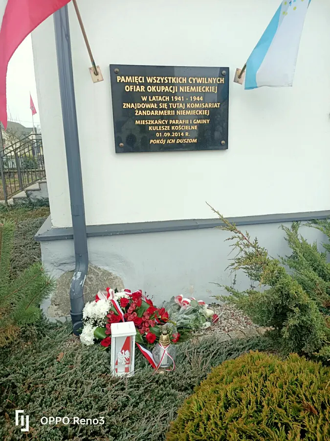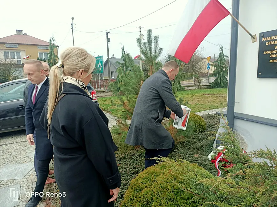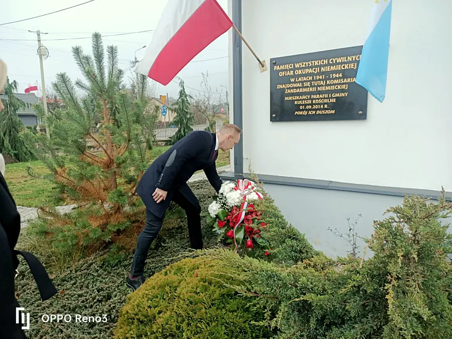 Kolejnym punktem obchodów było złożenie kwiatów pod tablicą upamiętniającą ofiary okupacji niemieckiej, która znajduje się przy budynku parafialnym.