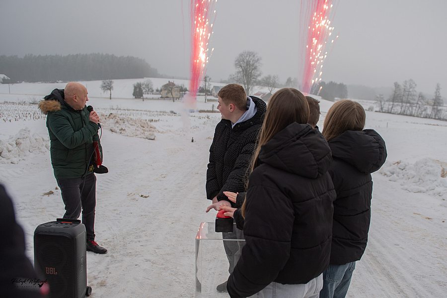 Rolę mistrza ceremonii przejął znany w regionie Zbyszek Perkowski, który swoimi komentarzami rozgrzewał zmarzniętych gości. – Proszę państwa, to jest wiekopomna chwila dla gminy Kulesze Kościelne. Poszła reprezentacja, chyba coś odpalić! – relacjonował na żywo, gdy w stronę oddalonego o około dwieście metrów mostu ruszyła zaledwie trzyosobowa delegacja: Wójt, przedstawiciel straży pożarnej oraz ksiądz. Reszta zgromadzonych obserwowała tę "wyprawę" z daleka.