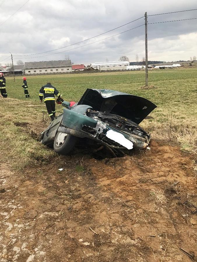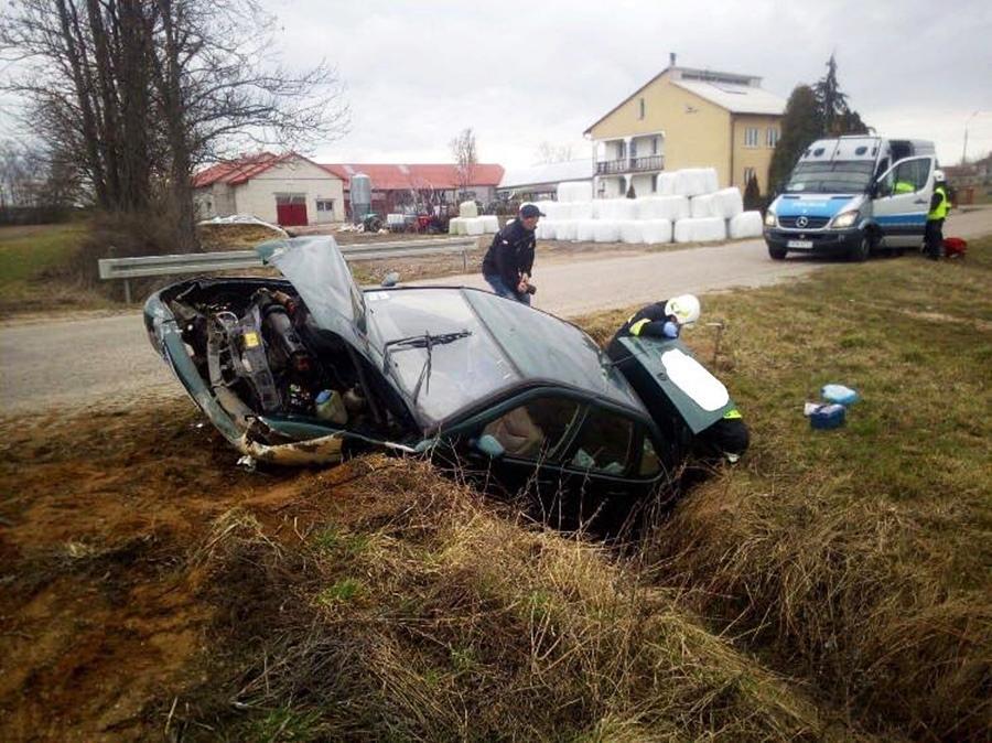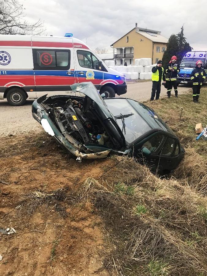 Kierowca osobówki stracił panowanie nad pojazdem, zjechał do przydrożnego rowu i uderzył w przepust. Niezwykle groźnie wyglądające zdarzenie drogowe na szczęście skończyło się bez poważnych obrażeń dla podróżujących samochodem.