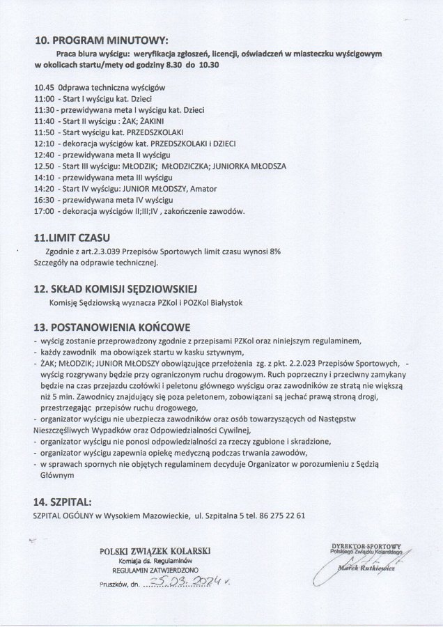 Harmonogram dnia wyścigu jest szczegółowo określony, z początkiem o 8:30, kiedy to rozpocznie się otwarcie biura i weryfikacja zgłoszeń. Sam start wyścigów zaplanowano na godzinę 11:00. Całość zostanie zwieńczona ceremonią dekoracji zwycięzców o godzinie 17:00.