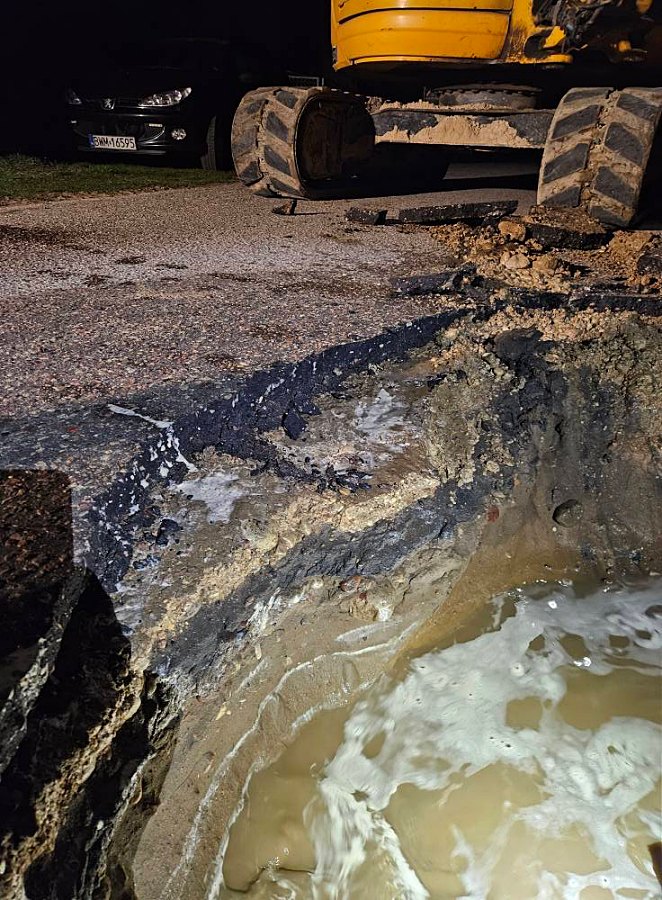 - "O godzinie 1:20 otrzymaliśmy zgłoszenie o dużej awarii wodociągu na ulicy Wesołej w Kuleszach Kościelnych, zlokalizowanie usterki i jej usunięcie wymagało niestety zamknięcia dostaw wody do połowy odbiorców z terenu gminy. Nasi konserwatorzy (Darek, Andrzej i kierowca OSP Zdzislaw) i operatorzy koparek z firmy FORMA pracowali przez całą noc żeby przywrócić dostawy wody jak najszybciej. Sytuacja jest już opanowana, awaria usunięta i czekamy na ustabilizowanie się ciśnienia w całym wodociągu, proszę o cierpliwość mieszkańców miejscowości Gołasze Dąb, Tybory Uszyńskie i Czarnowo Biki bo tam niestety może to potrwać jeszcze kilka godzin. Dziękuję za szybką i sprawną interwencję Panowie. Będziemy nadal pracować nad zabezpieczeniami przed powstawaniem awarii realizując nasze gminne inwestycje" - przekazał dzisiaj rano wójt Stefan Grodzki.