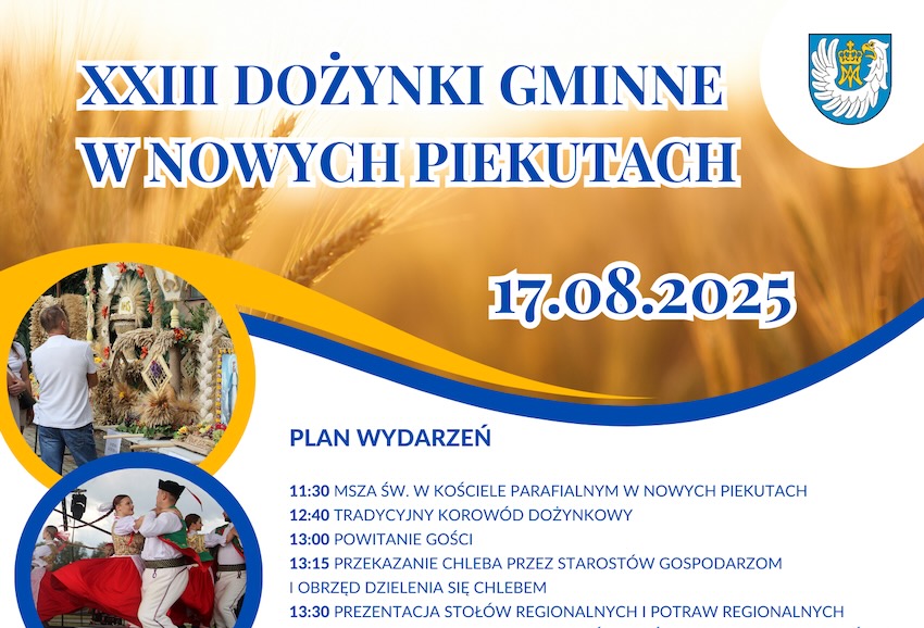 W niedzielę, 17 sierpnia, w Nowych Piekutach odbyły się XXIII Dożynki Gminne, stanowiące zwieńczenie tegorocznych żniw i okazję do podziękowania rolnikom za ich całoroczną pracę. Uroczystości połączyły tradycyjne obrzędy z programem artystycznym i licznymi atrakcjami dla mieszkańców i gości.