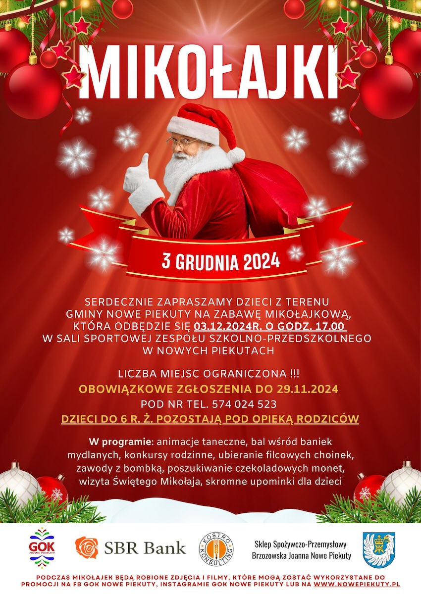 Gminny Ośrodek Kultury w Nowych Piekutach organizuje świąteczne spotkanie mikołajkowe dla dzieci z terenu gminy. Wydarzenie odbędzie się 3 grudnia 2024 roku o godzinie 17:00 w sali sportowej Zespołu Szkolno-Przedszkolnego w Nowych Piekutach.