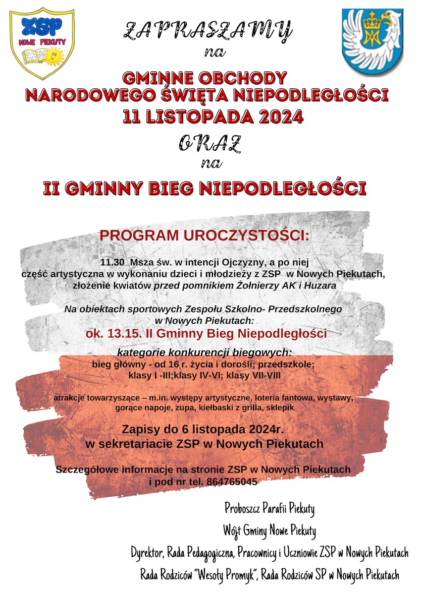 W Nowych Piekutach odbędą się gminne obchody Narodowego Święta Niepodległości połączone z II Gminnym Biegiem Niepodległości. Uroczystości zaplanowano na 11 listopada 2024 roku.