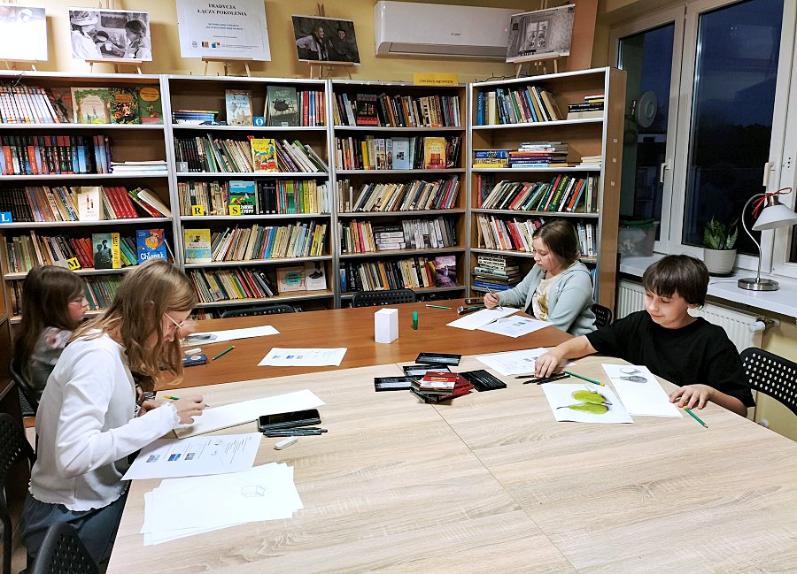 Na ostatnich zajęciach plastycznych w Gminnym Ośrodku Kultury w Nowych Piekutach młodzi artyści doskonalili swoje umiejętności rysunkowe. Dzieci pracowały nad odwzorowaniem gruszek oraz prostopadłościanów, ćwicząc technikę przedstawiania różnych kształtów i faktur.