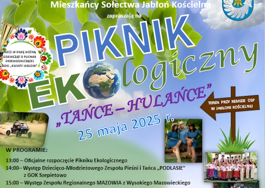 25 maja 2025 roku mieszkańcy gminy Nowe Piekuty i całego powiatu wysokomazowieckiego będą mogli wziąć udział w Pikniku Ekologicznym "Tańce-Hulańce". Wydarzenie odbędzie się na placu przy remizie OSP w Jabłoni Kościelnej. Organizatorami imprezy są Wójt Gminy Nowe Piekuty oraz mieszkańcy sołectwa Jabłoń Kościelna.