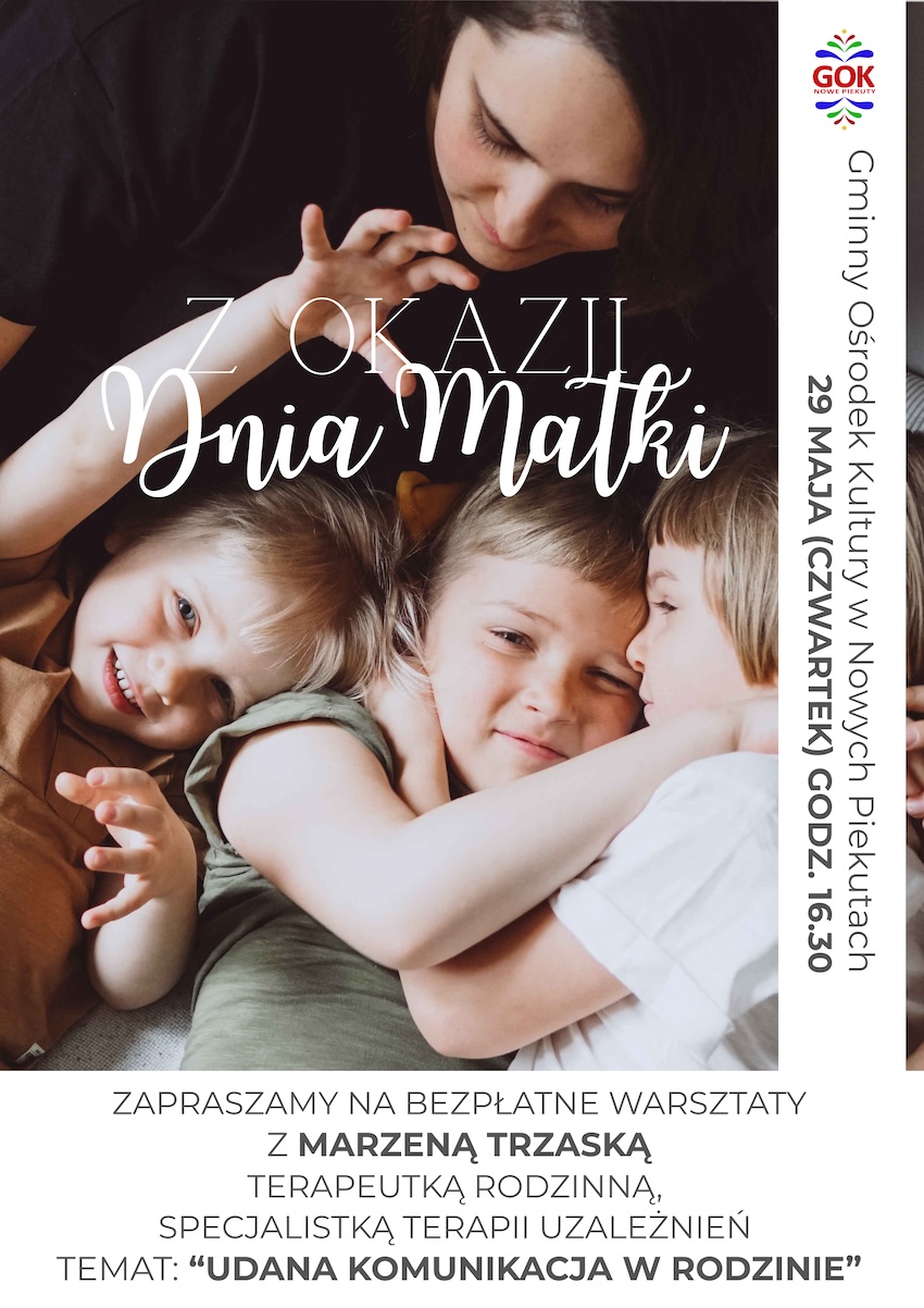Gminny Ośrodek Kultury w Nowych Piekutach organizuje bezpłatne warsztaty poświęcone komunikacji w rodzinie. Spotkanie odbędzie się 29 maja 2025 roku o godzinie 16:30 w siedzibie ośrodka kultury. Warsztaty poprowadzi Marzena Trzaska, terapeutka rodzinna i specjalistka terapii uzależnień.